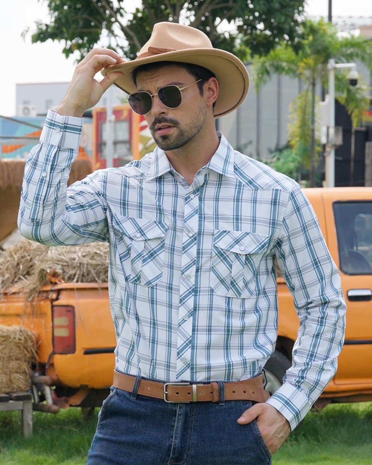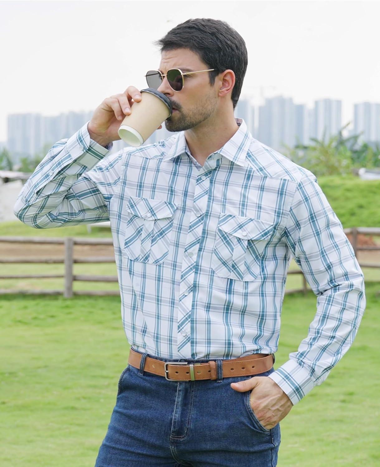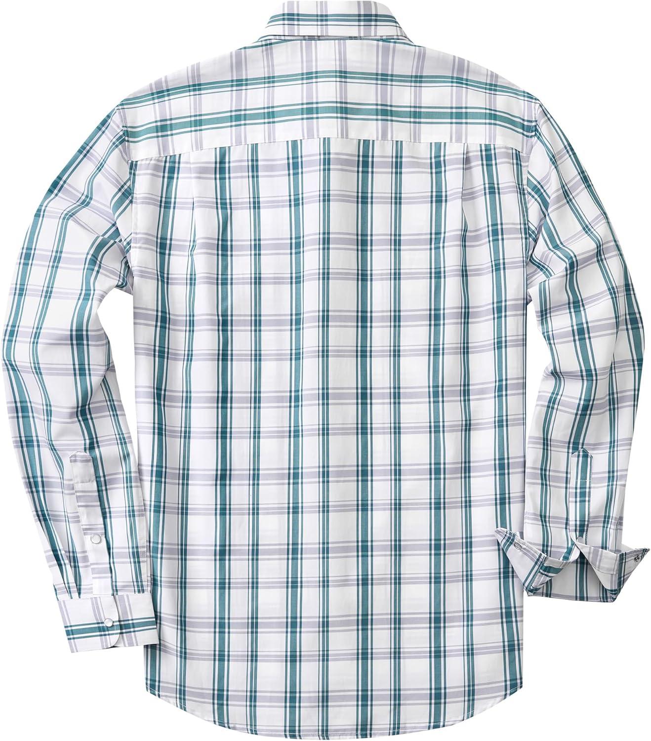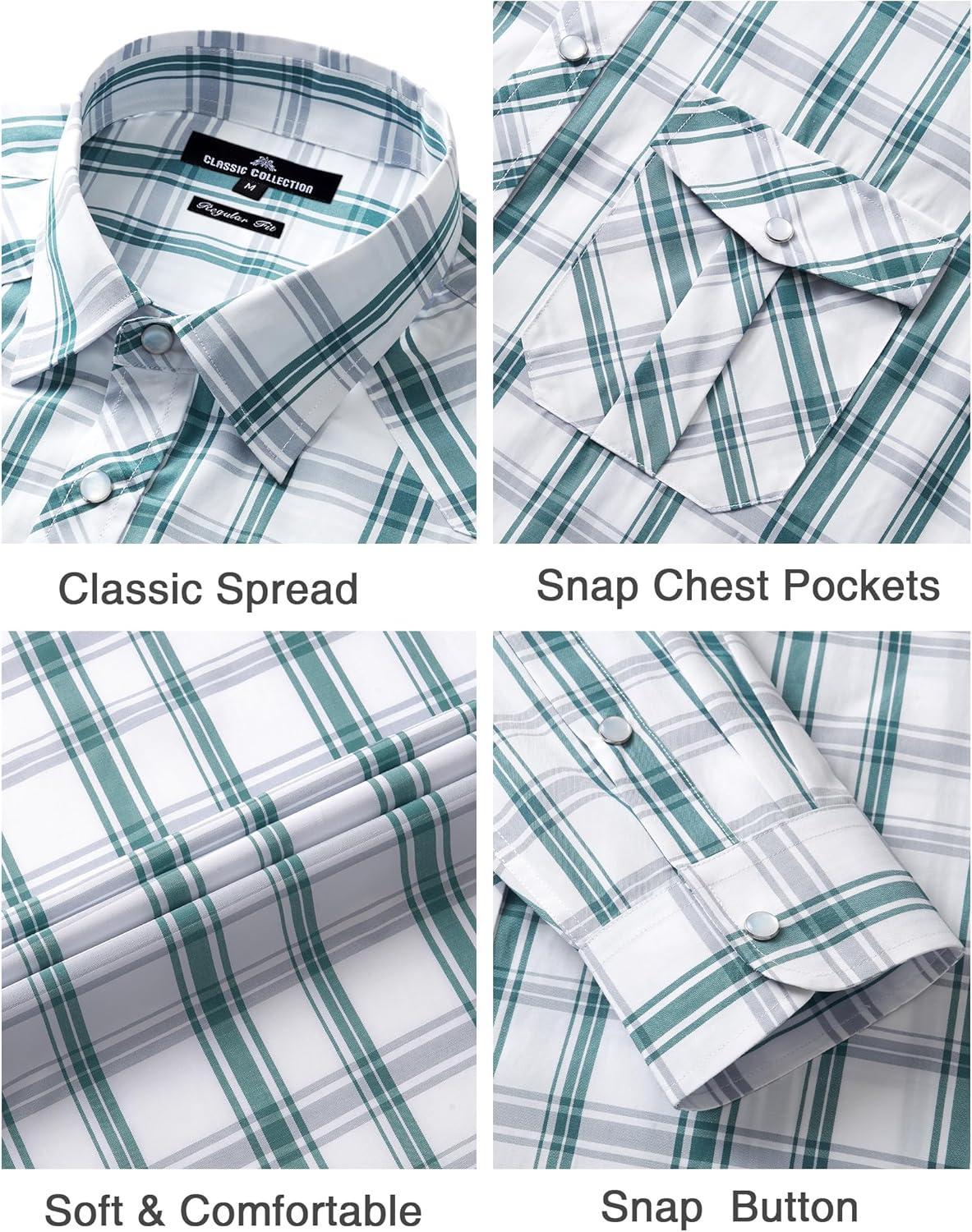 Men’s Plaid Pearl Snap Button Shirts Casual Long Sleeve Checked Shirt Western Cowboy Shirts with Two Pockets for Work