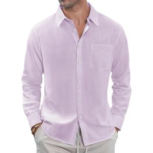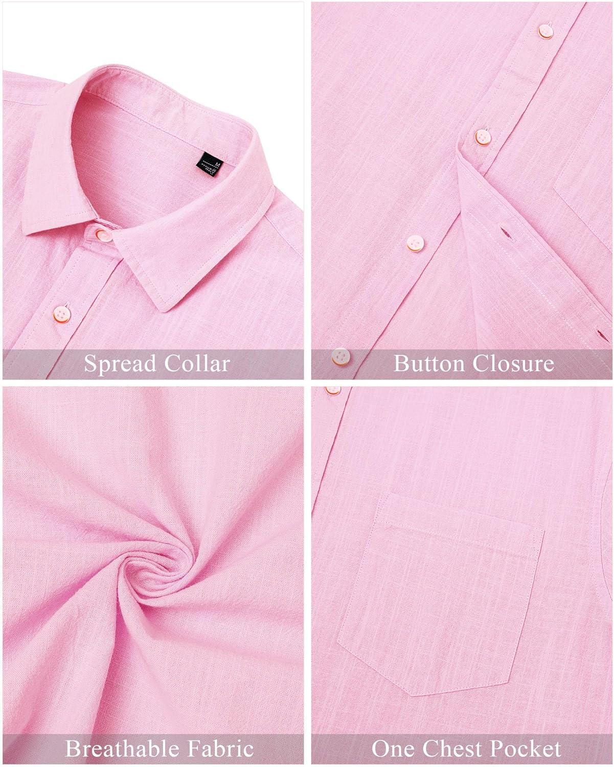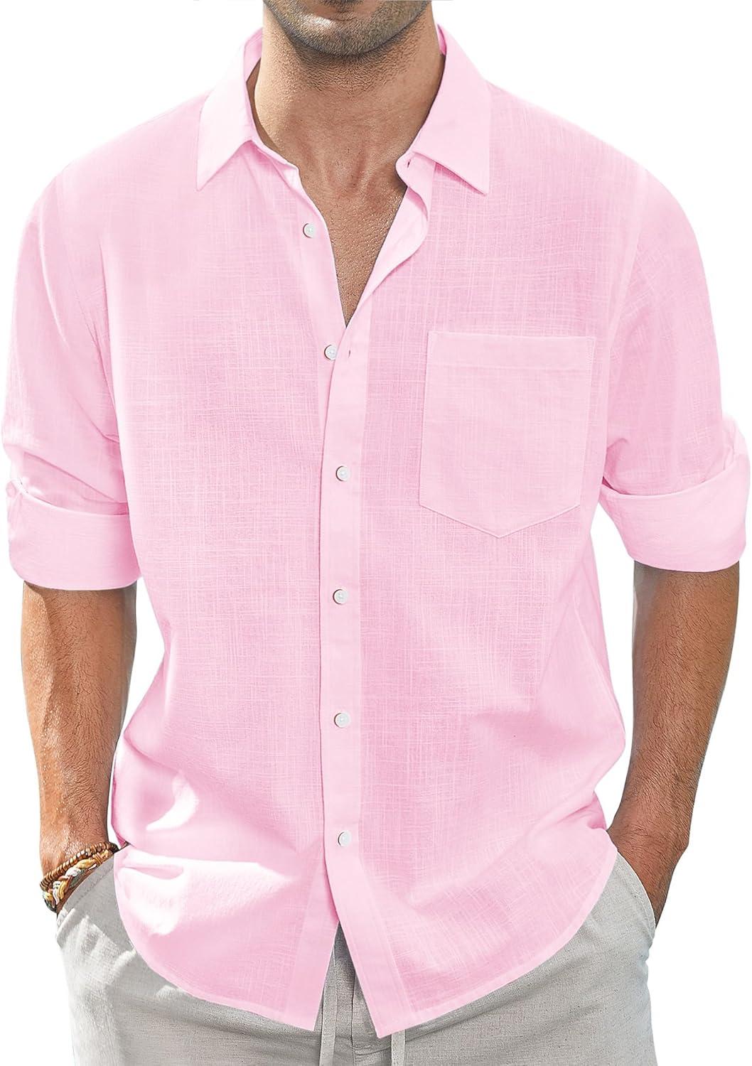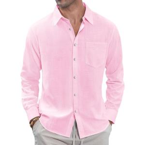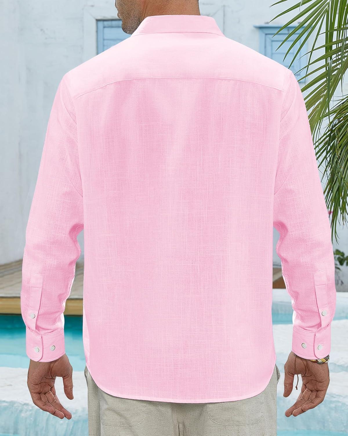 J.VER Men’s Linen Shirts Casual Button Down Long Sleeve Shirt Solid Spread Collar Summer Beach Shirts with Pocket(Light Pink)