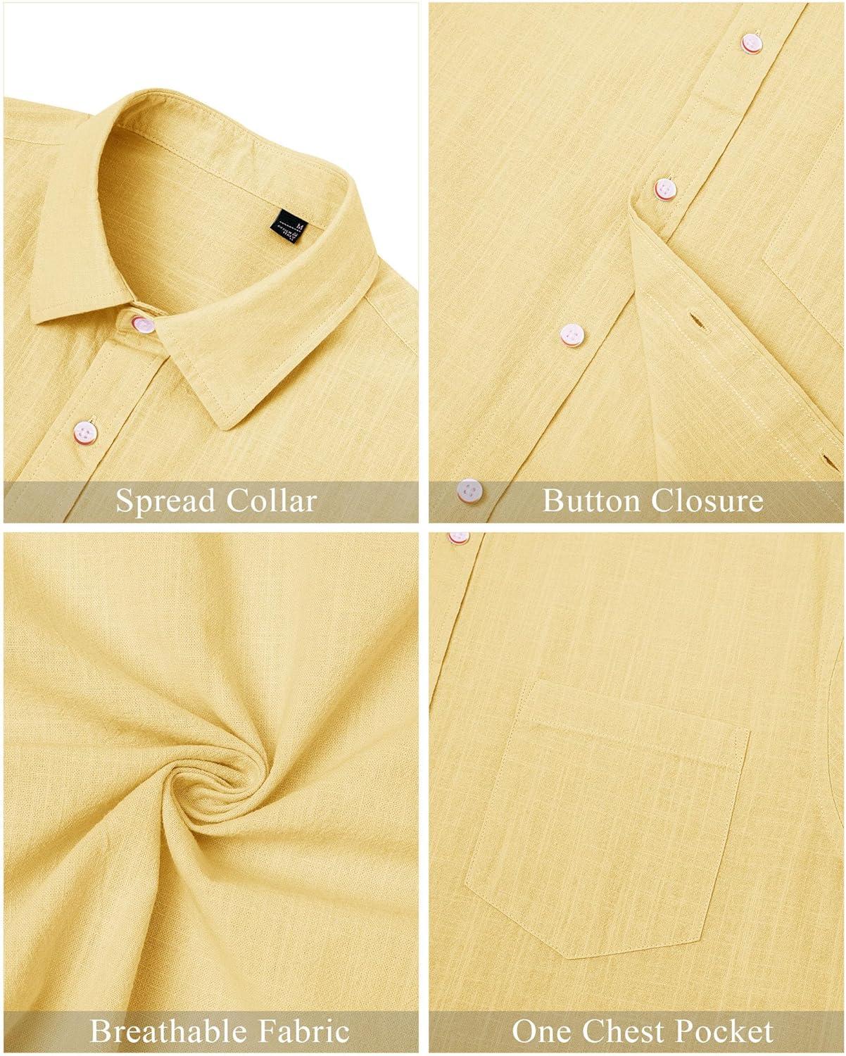 J.VER Men’s Linen Shirts Casual Button Down Long Sleeve Shirt Solid Spread Collar Summer Beach Shirts with Pocket(Light Yellow)