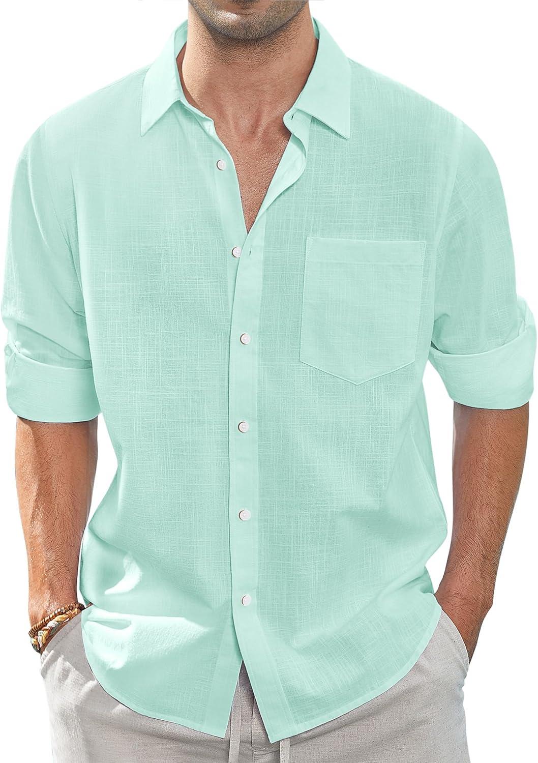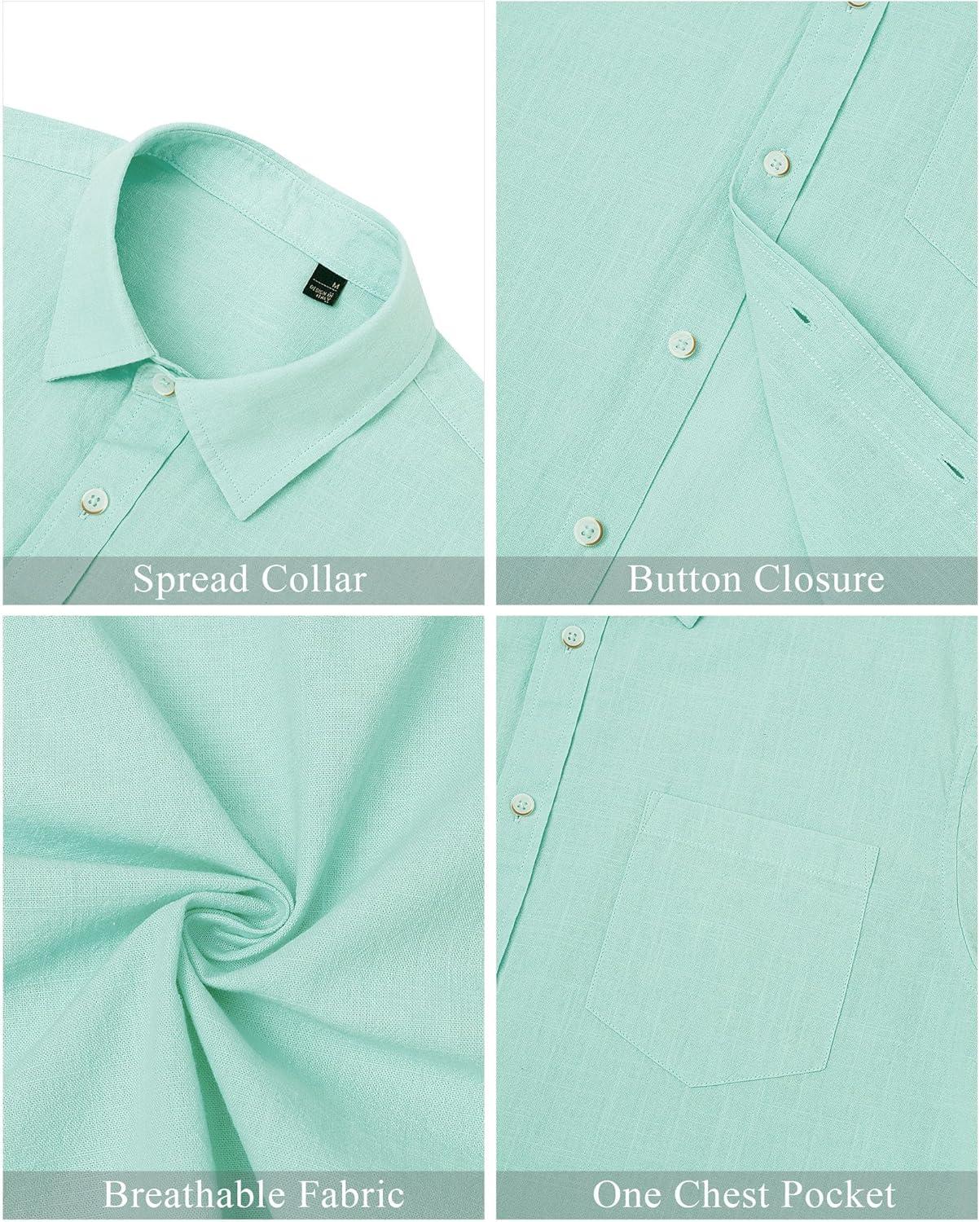 J.VER Men’s Linen Shirts Casual Button Down Long Sleeve Shirt Solid Spread Collar Summer Beach Shirts with Pocket(Mint Green)