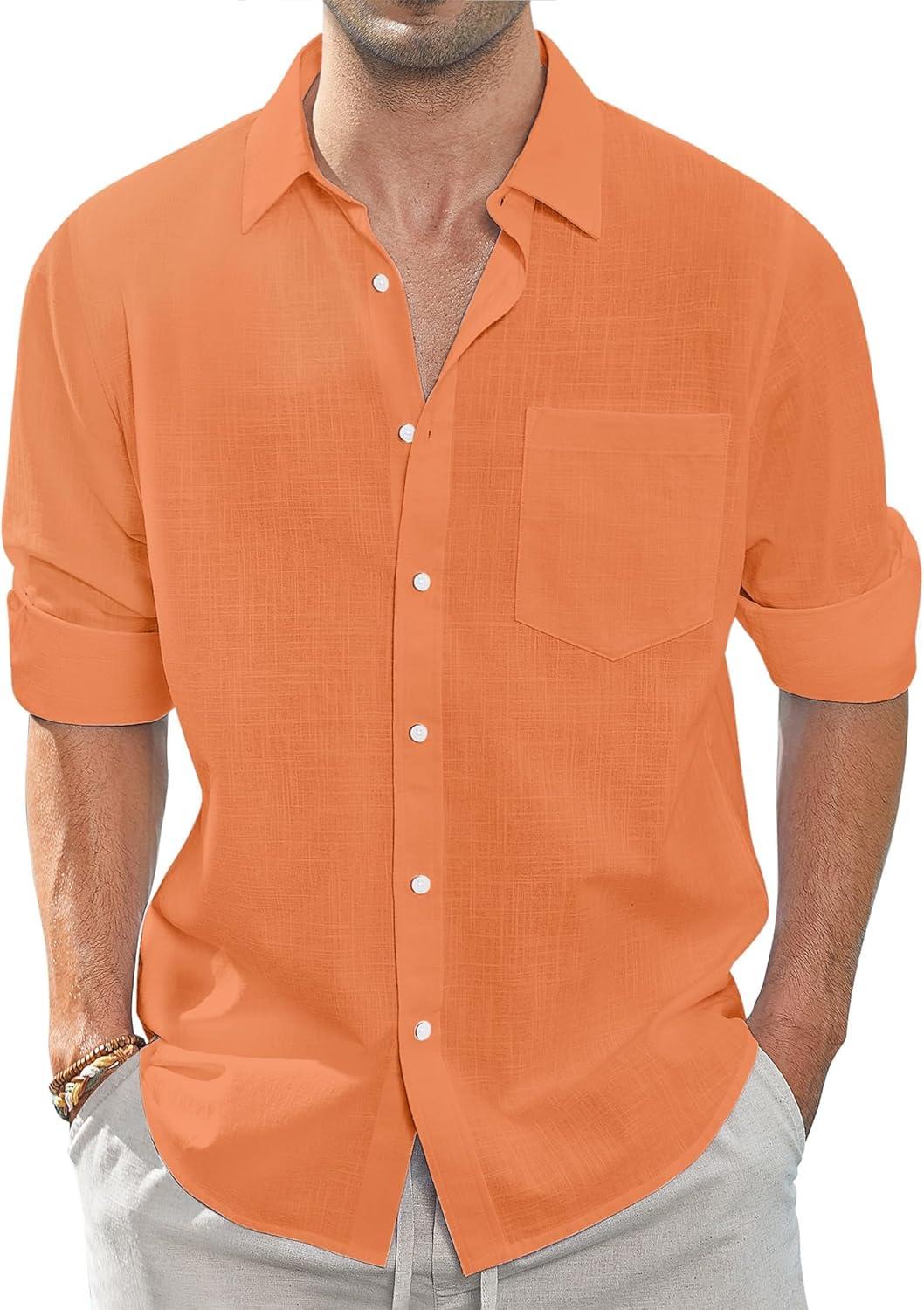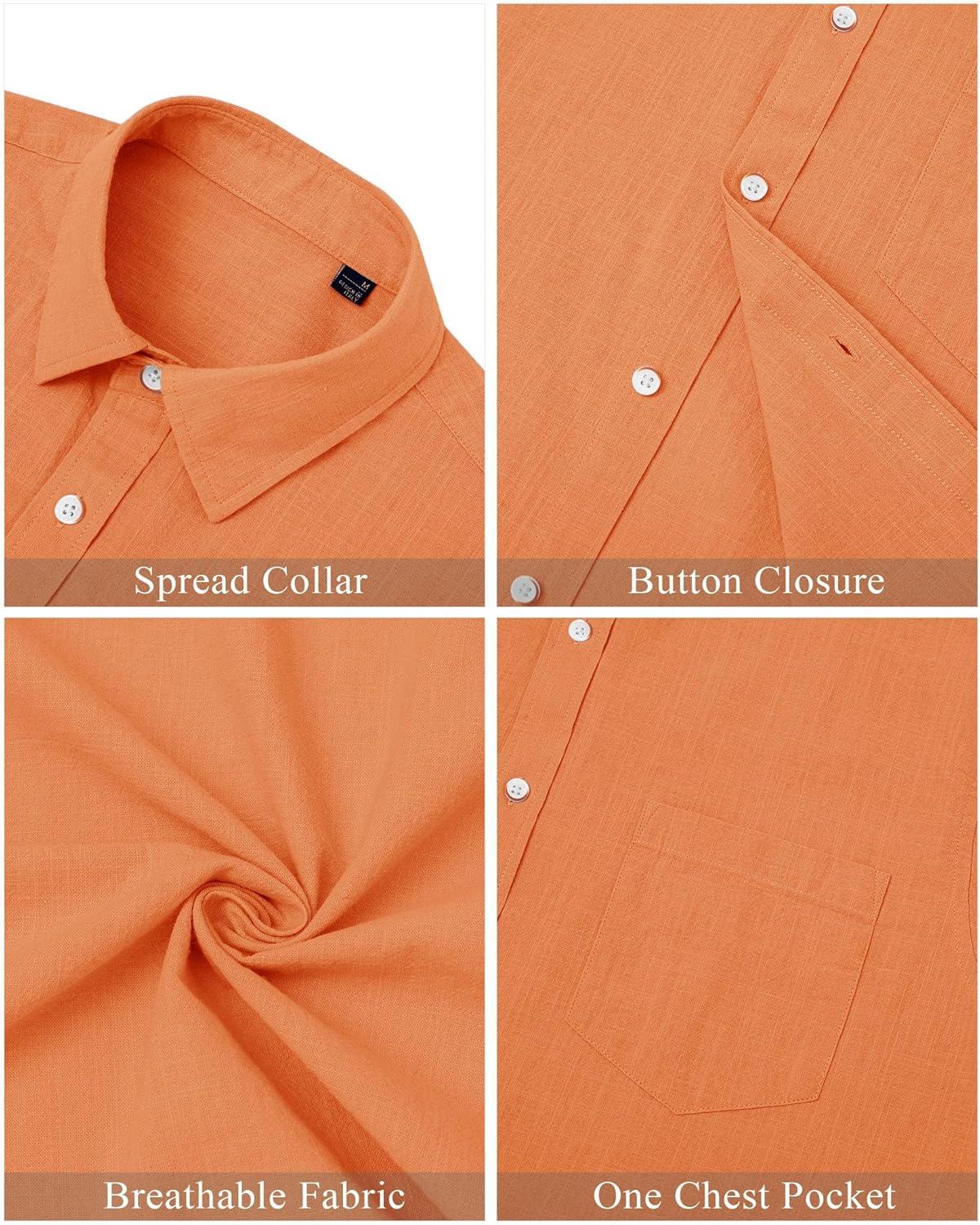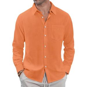 J.VER Men’s Linen Shirts Casual Button Down Long Sleeve Shirt Solid Spread Collar Summer Beach Shirts with Pocket(Orange)