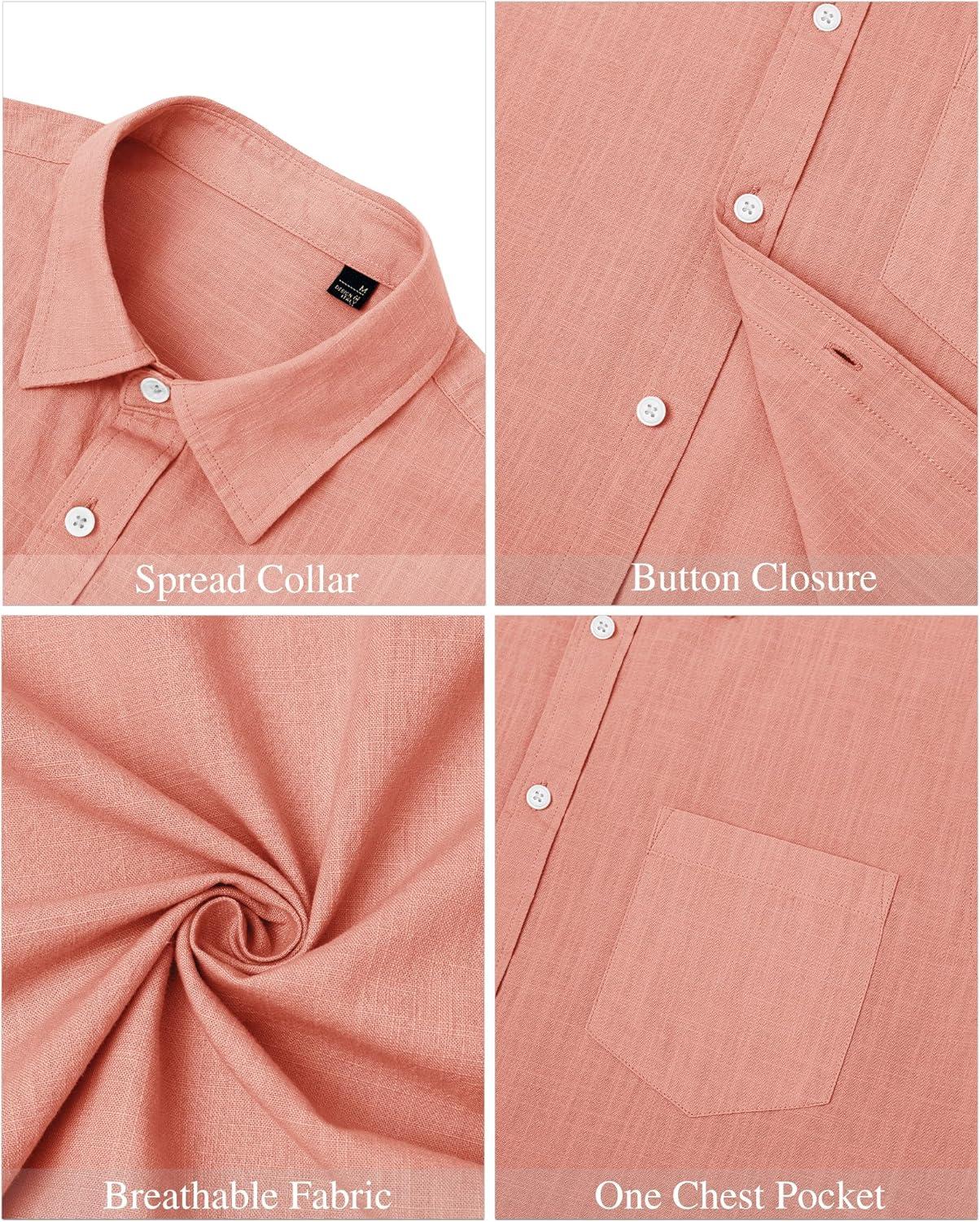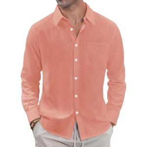 J.VER Men’s Linen Shirts Casual Button Down Long Sleeve Shirt Solid Spread Collar Summer Beach Shirts with Pocket(Coral)