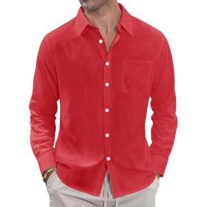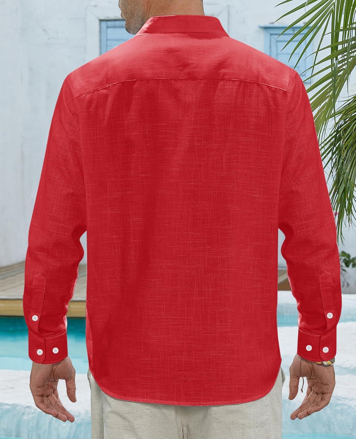 J.VER Men’s Linen Shirts Casual Button Down Long Sleeve Shirt Solid Spread Collar Summer Beach Shirts with Pocket(Red)