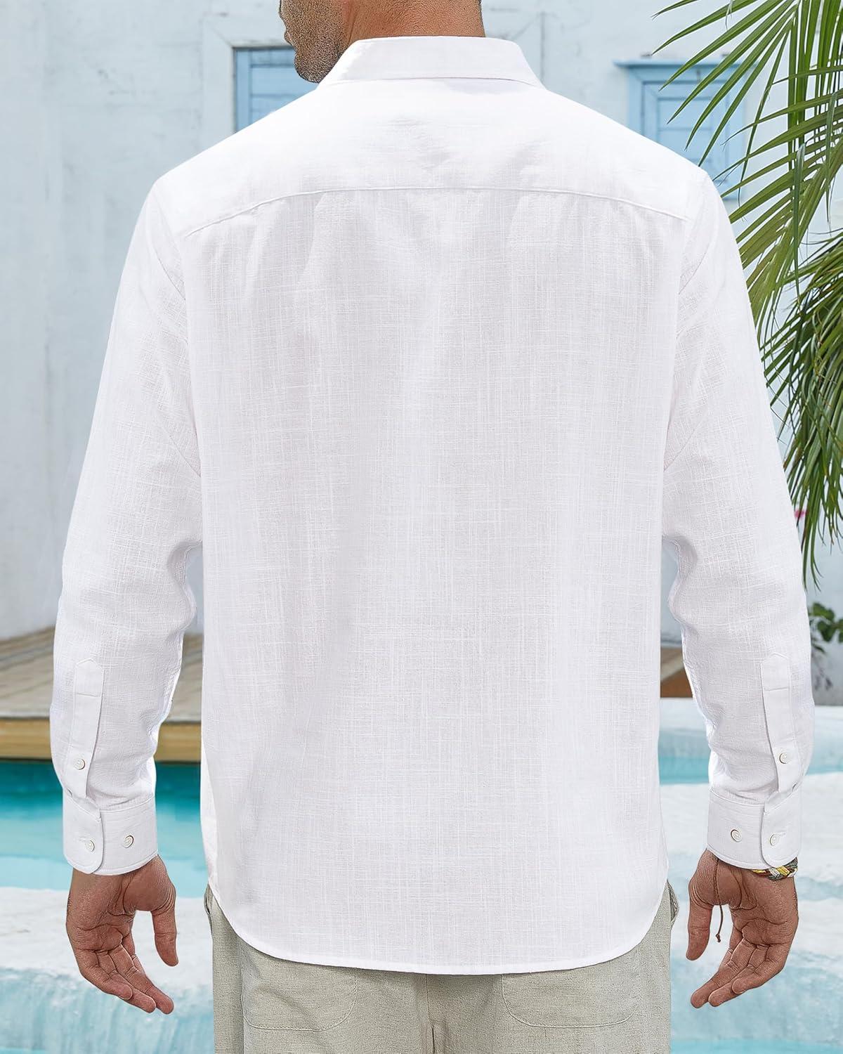 J.VER Men’s Linen Shirts Casual Button Down Long Sleeve Shirt Solid Spread Collar Summer Beach Shirts with Pocket(White)