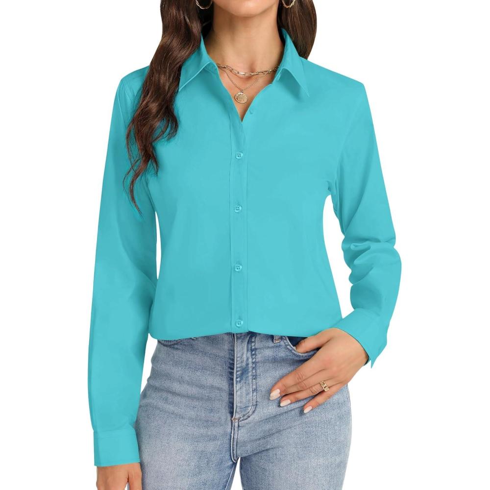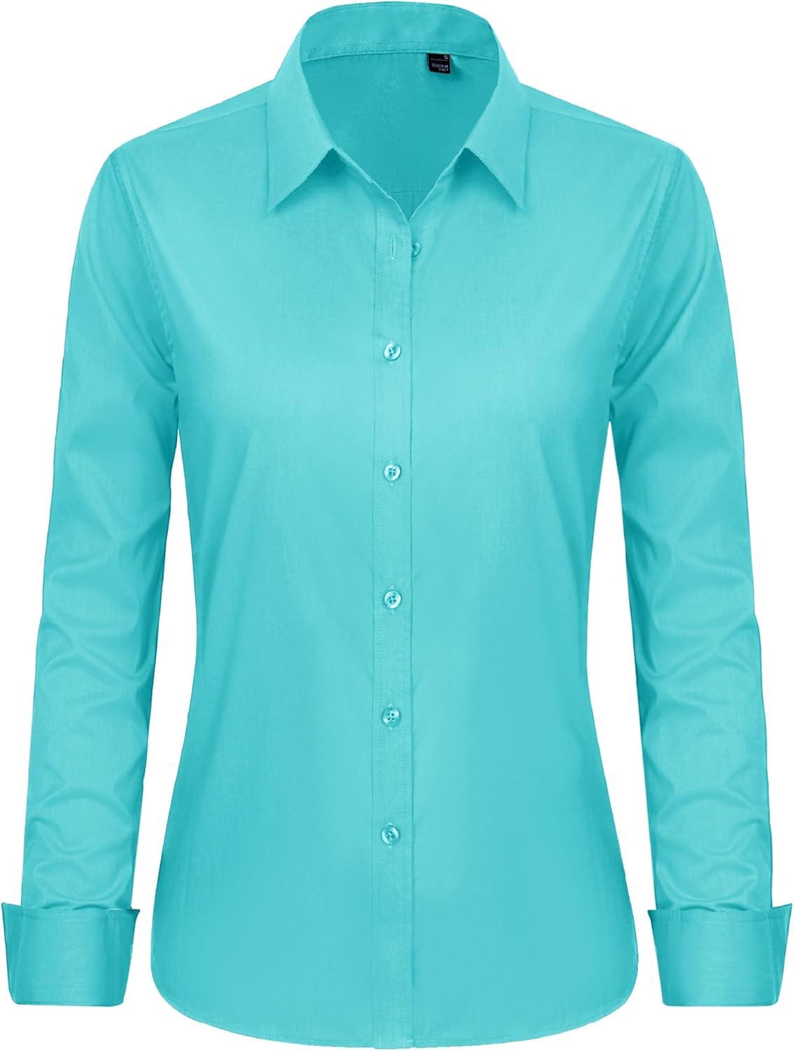 J.VER Button Down Shirts for Women Stretch Collared Cotton Long Sleeve Dress Shirt Business Casual Blouse for Work(Aqua Blue)