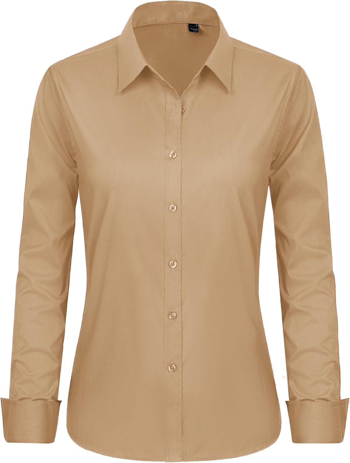J.VER Button Down Shirts for Women Stretch Collared Cotton Long Sleeve Dress Shirt Business Casual Blouse for Work(Khaki)