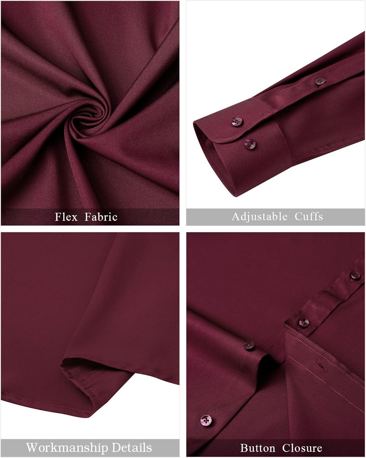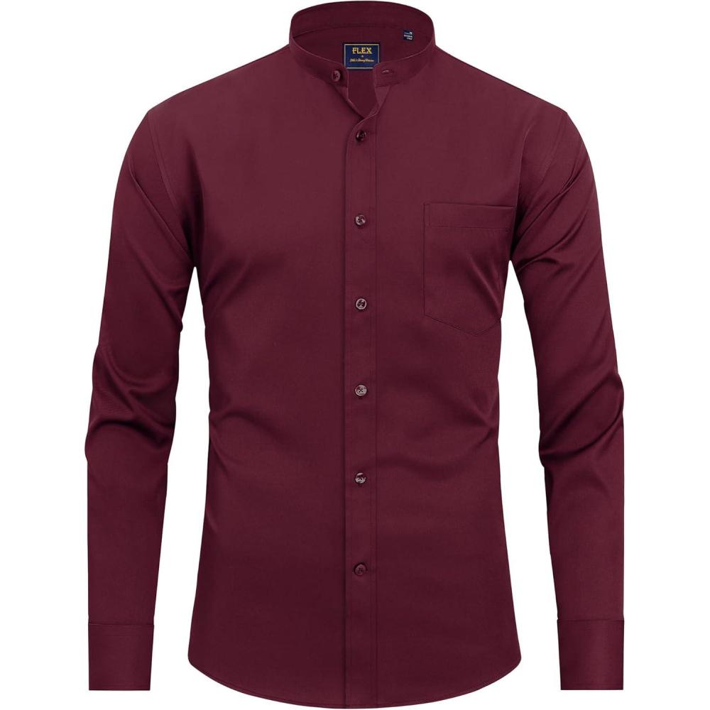 J.VER Men’s Banded Collar Dress Shirt Mandarin Long Sleeve Button Down Shirts Stretch Collarless Tops with Pocket(Burgundy)