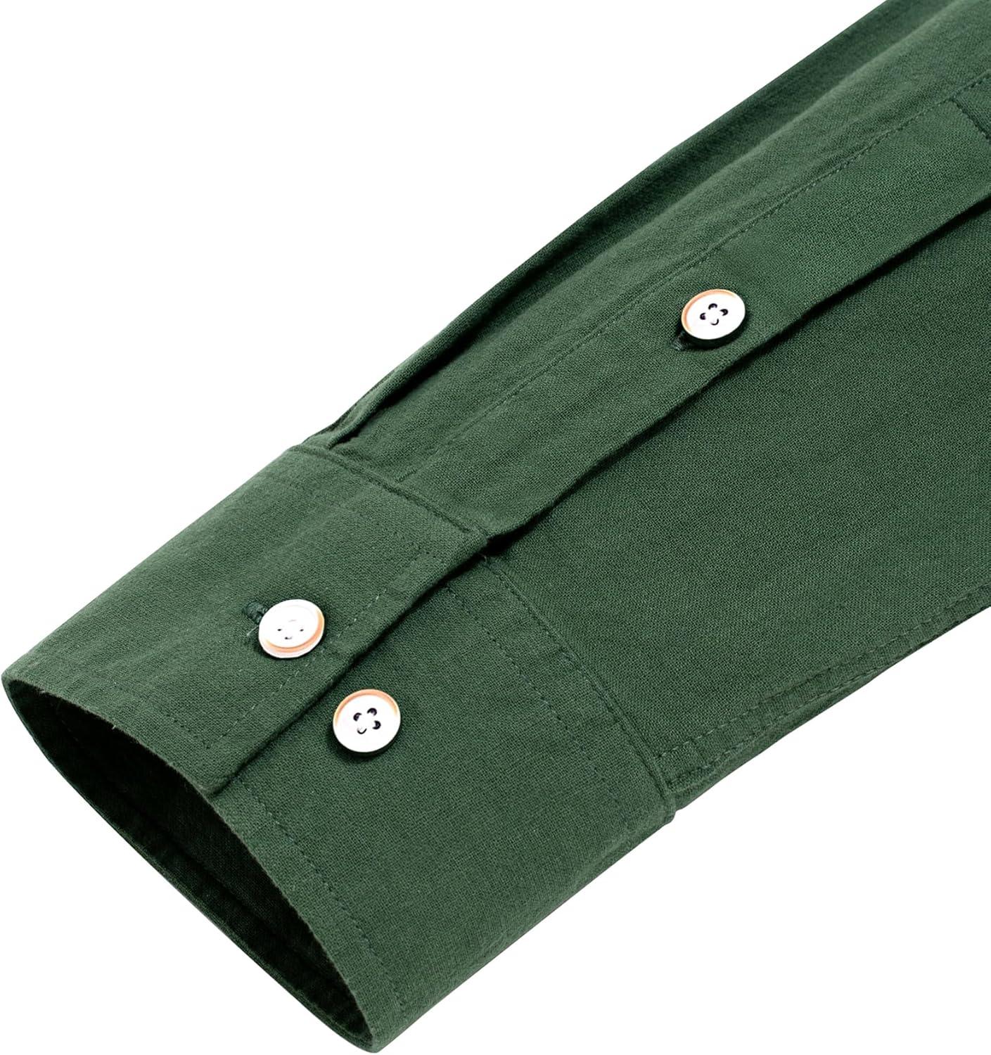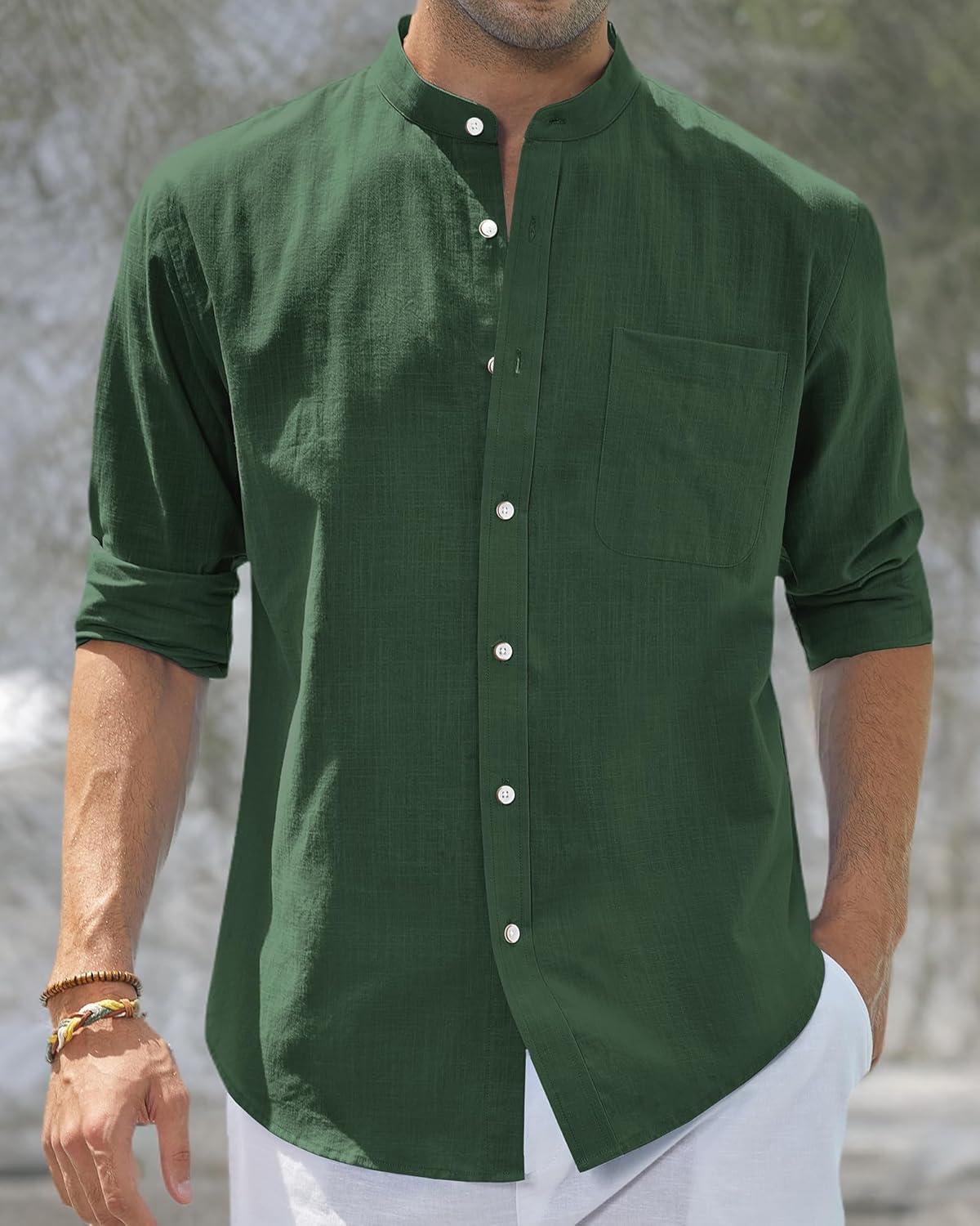 J.VER Men’s Cotton Linen Long Sleeve Shirts Casual Button Down Banded Collar Shirt Beach Summer Tops with Pocket(Army Green)
