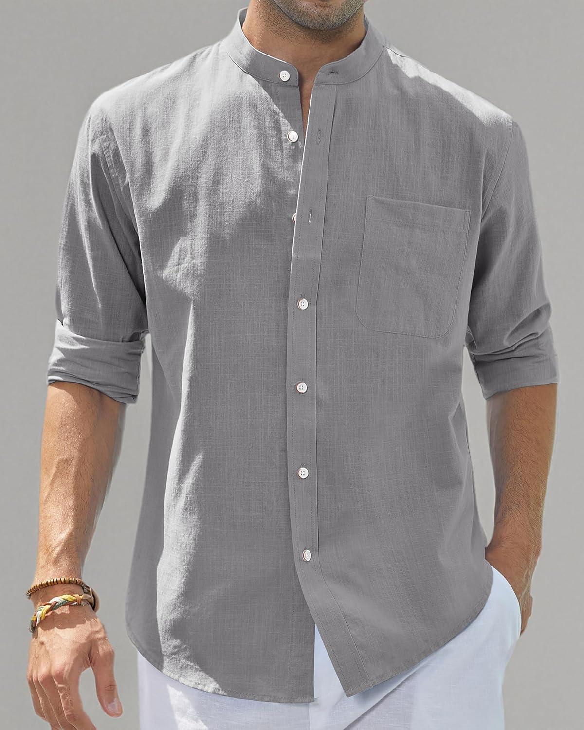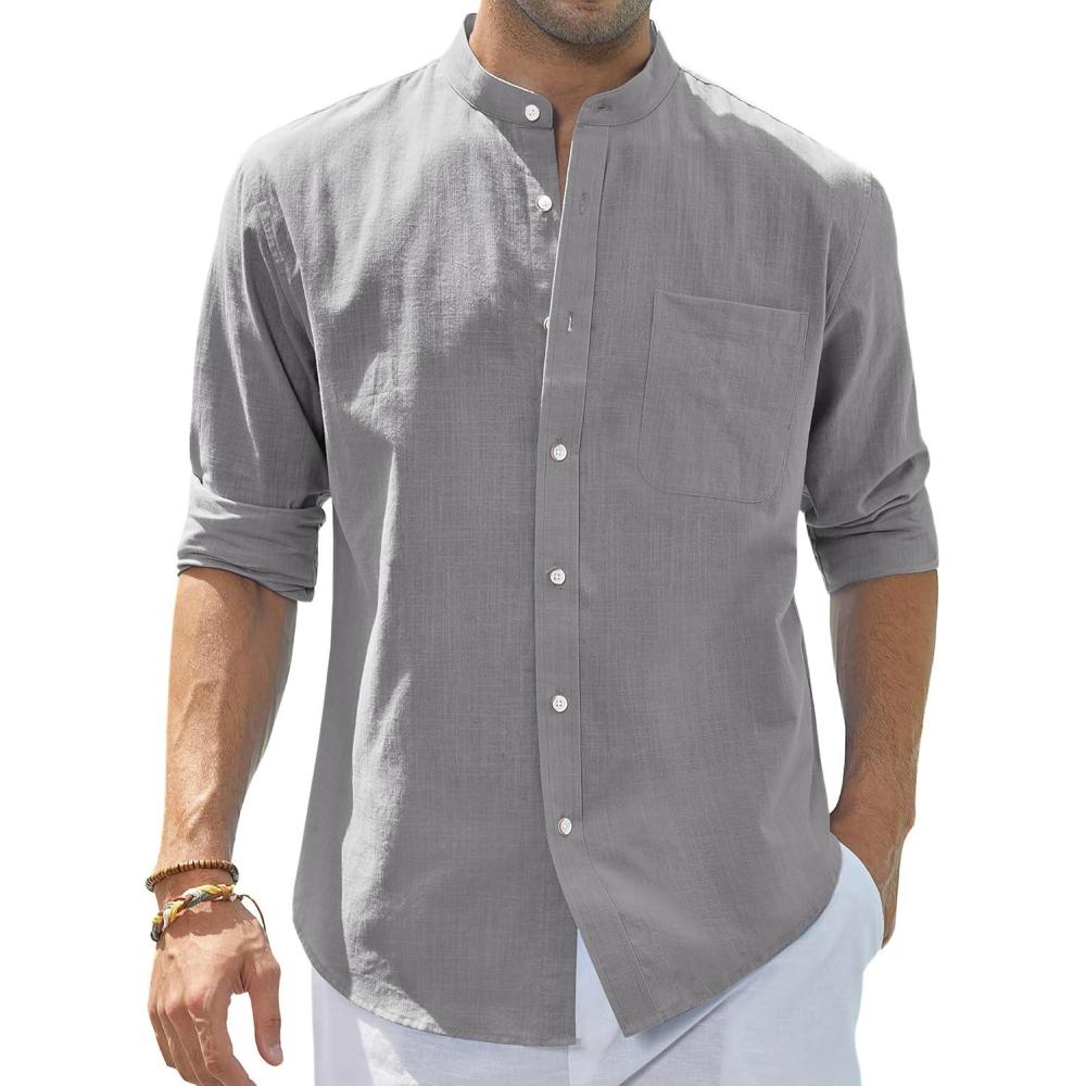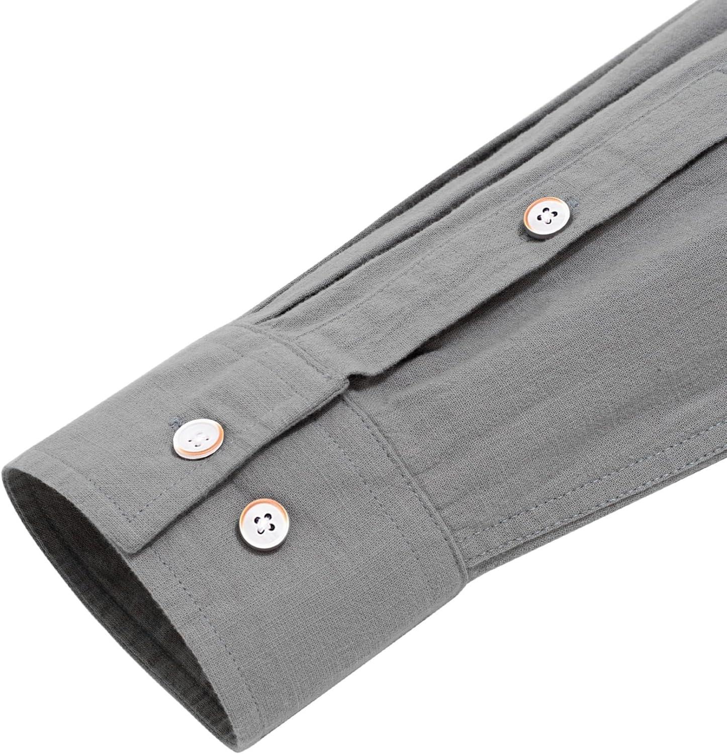 J.VER Men’s Cotton Linen Long Sleeve Shirts Casual Button Down Banded Collar Shirt Beach Summer Tops with Pocket(Dark Grey)