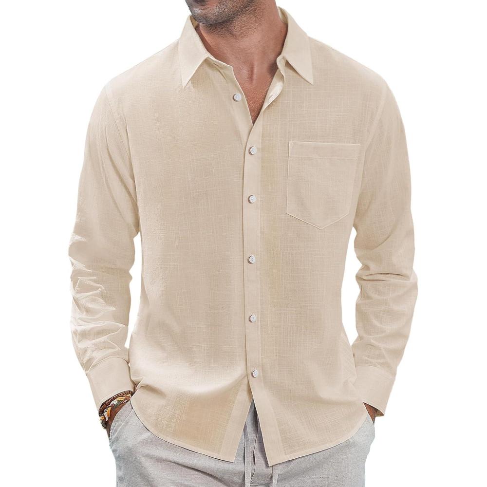 J.VER Men’s Linen Shirts Casual Button Down Long Sleeve Shirt Solid Spread Collar Summer Beach Shirts with Pocket(Light Khaki)