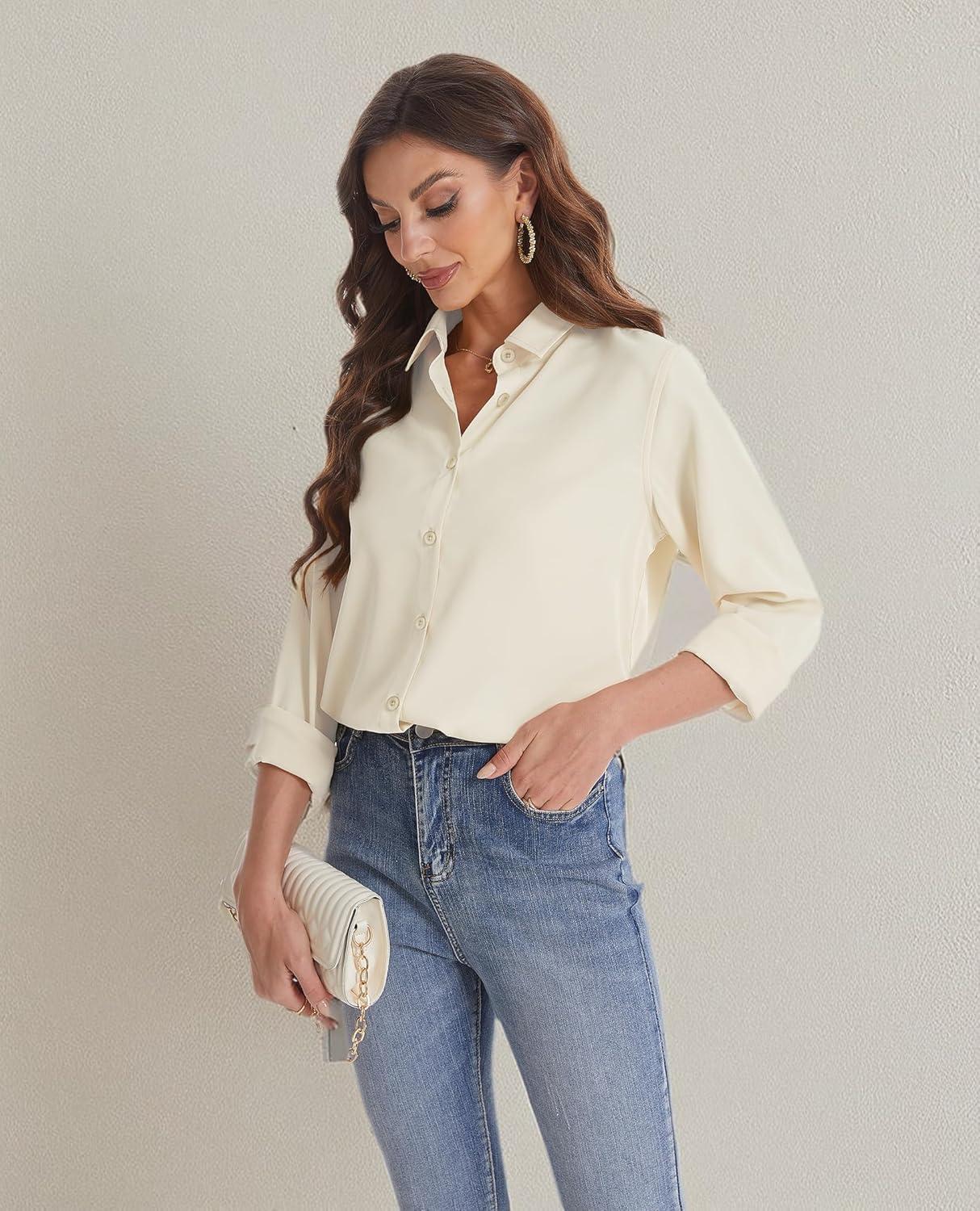 J.VER Women’s Button Down Shirt Long Sleeve Solid Dress Shirts Chiffon Work Office Blouse Fashion Formal Business Casual Tops(Beige)