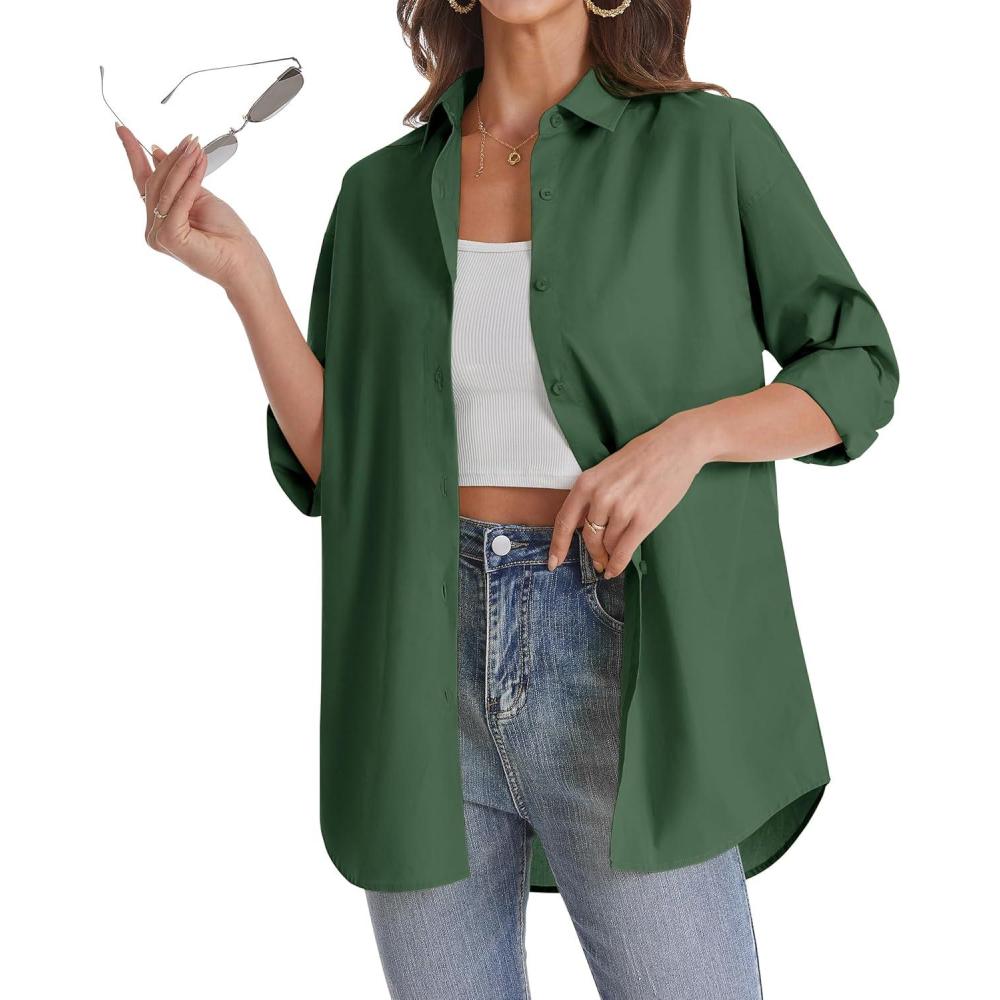 J.VER Womens Oversized Button Down Shirts Casual Long Sleeve Lightweight Breathable Solid Cotton Blouse Office Dress Shirt(Army Green)
