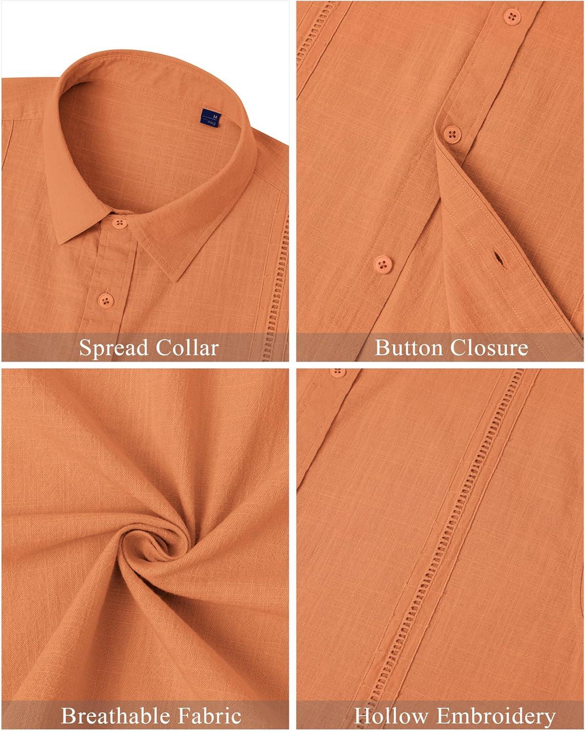 Mens Linen Shirts Short Sleeve Button Down Shirt Casual Cuban Guayabera Lightweight Summer Beach Solid Tops(Bright Orange)