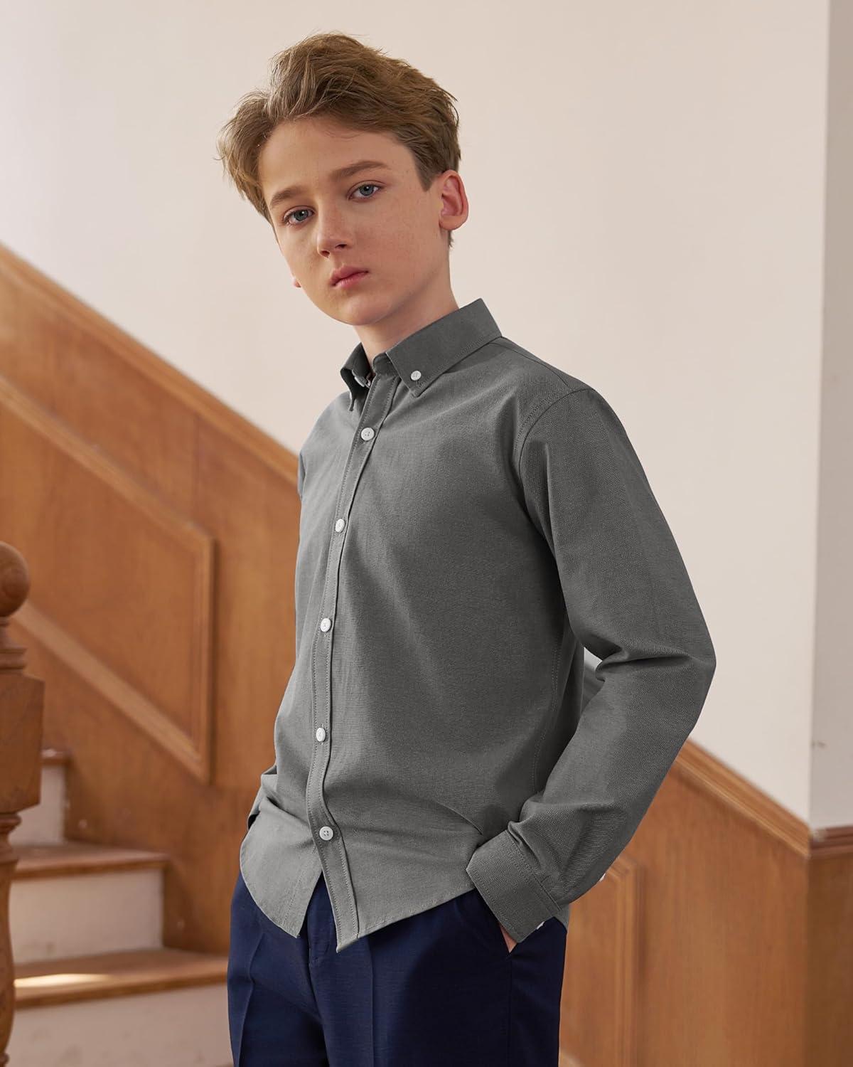 • J.VER Boy’s Long Sleeve Oxford Dress Shirts Solid Casual Button Down Collar Shirt Kids Formal Uniform Tops(Grey)