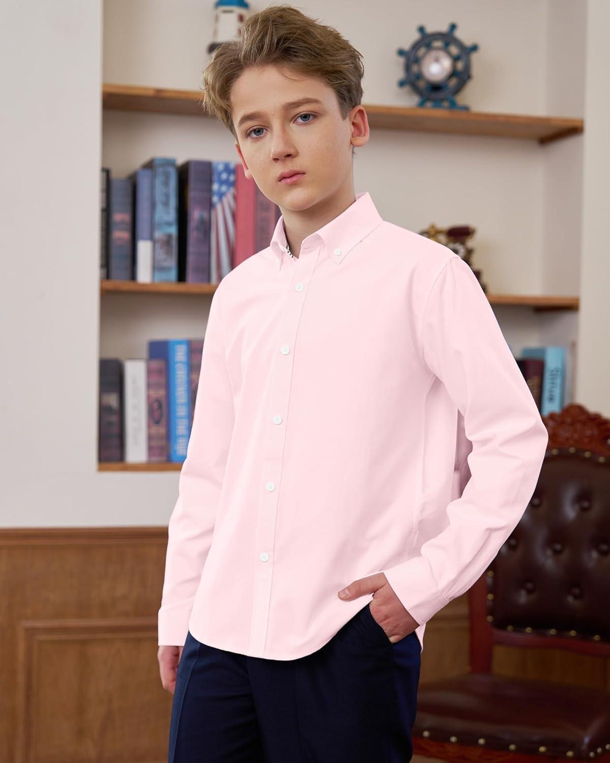 J.VER Boy’s Long Sleeve Dress Shirts Solid Stretch Wrinkle-Free Shirt Kids Casual Button Down Shirts School Uniform(Pink)