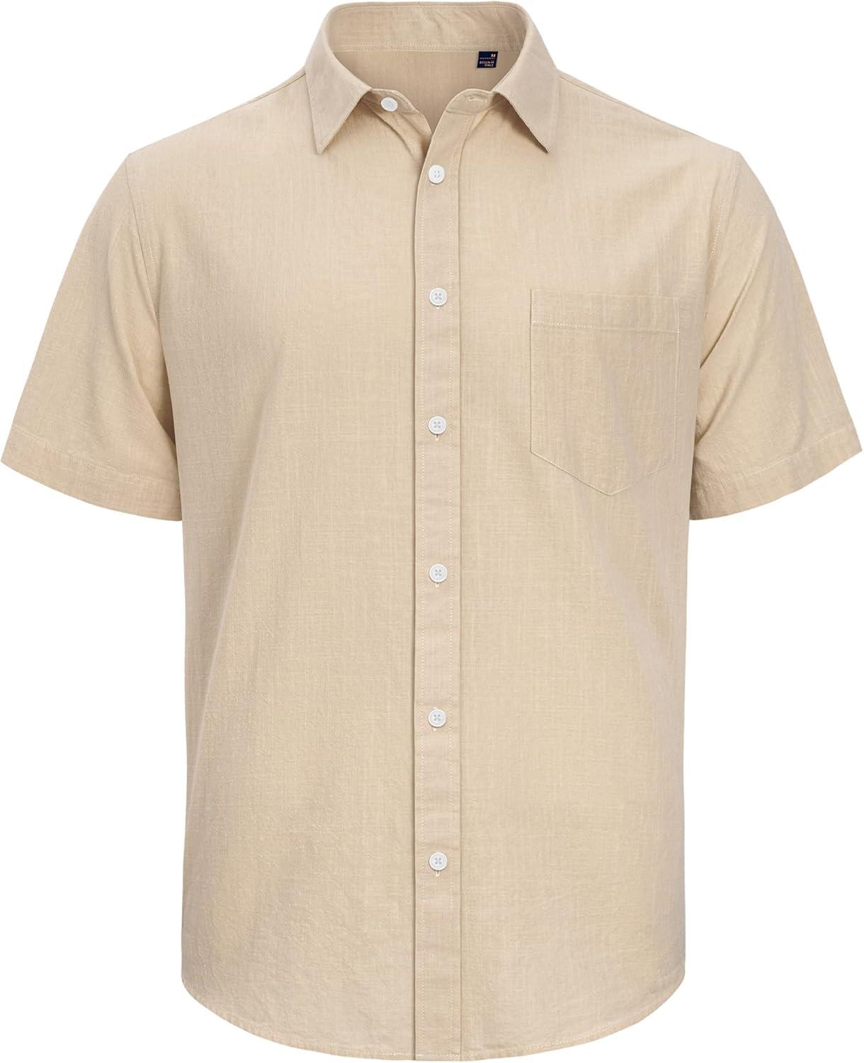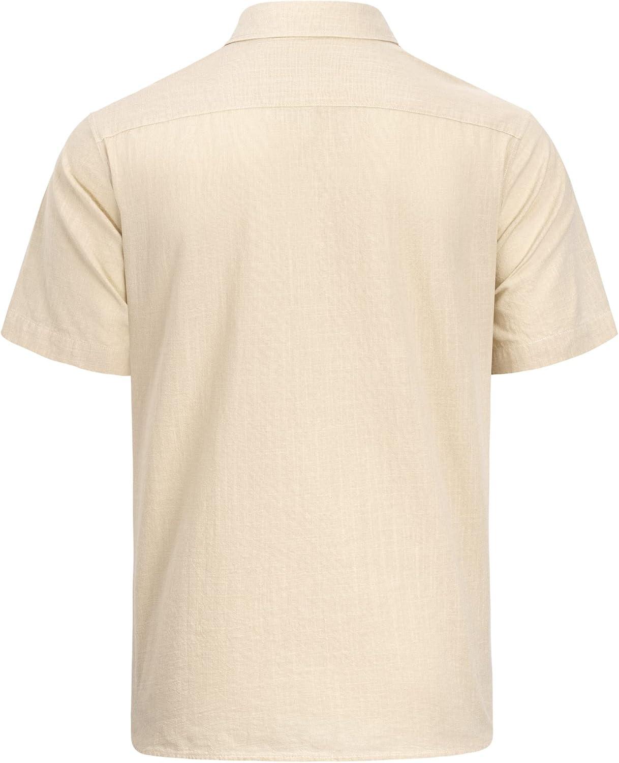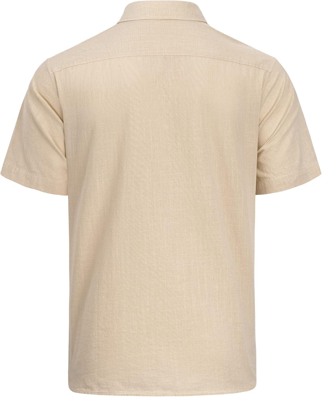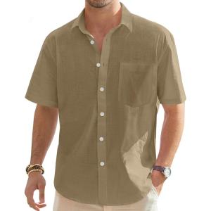 Mens Linen Shirts Short Sleeve Button Down Shirt Casual Cuban Guayabera Lightweight Summer Beach Solid Tops(Light Khaki)