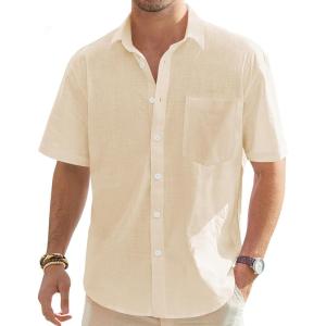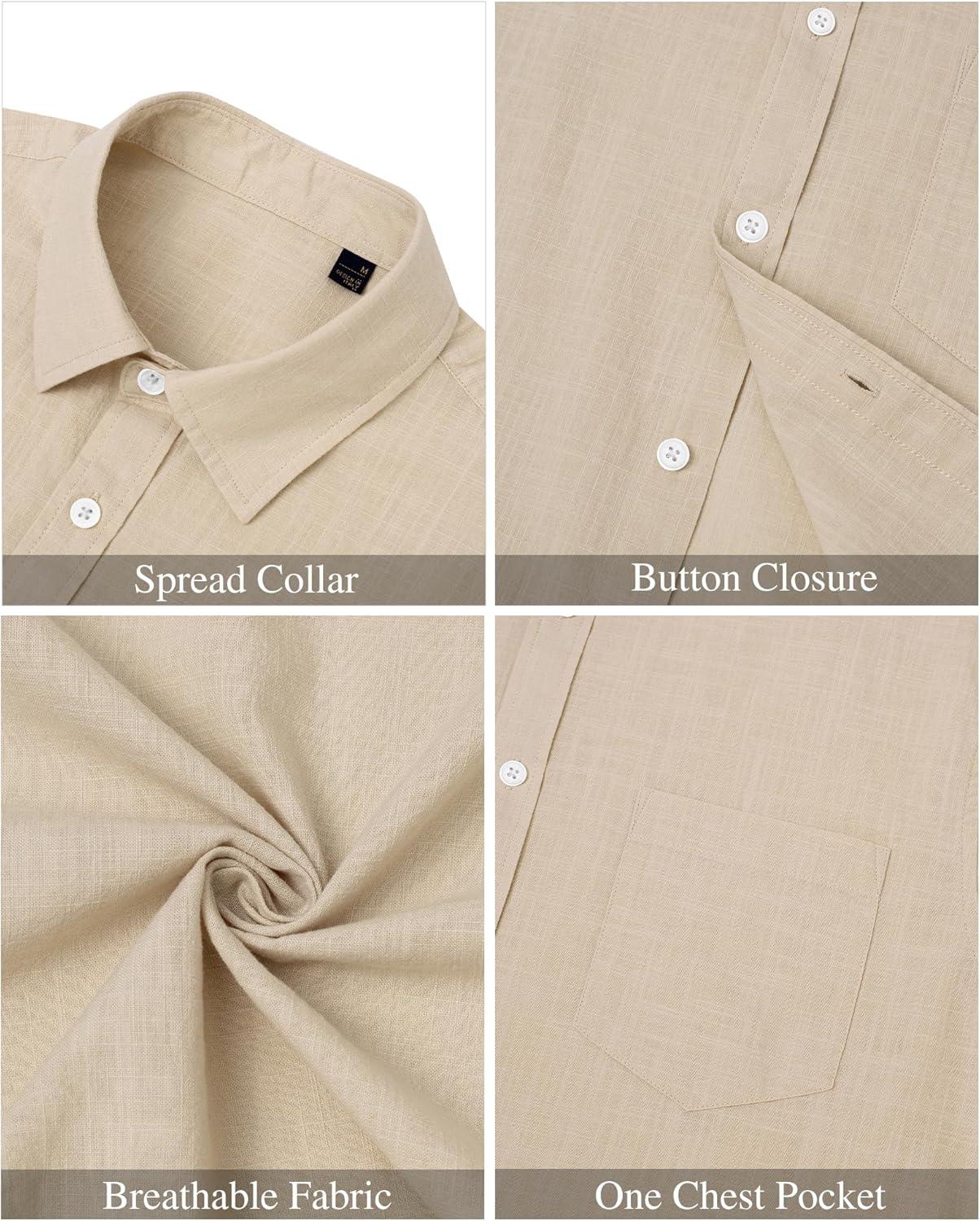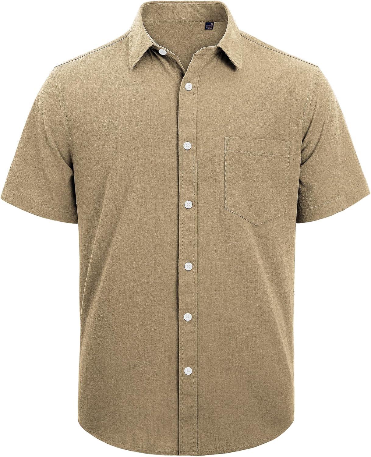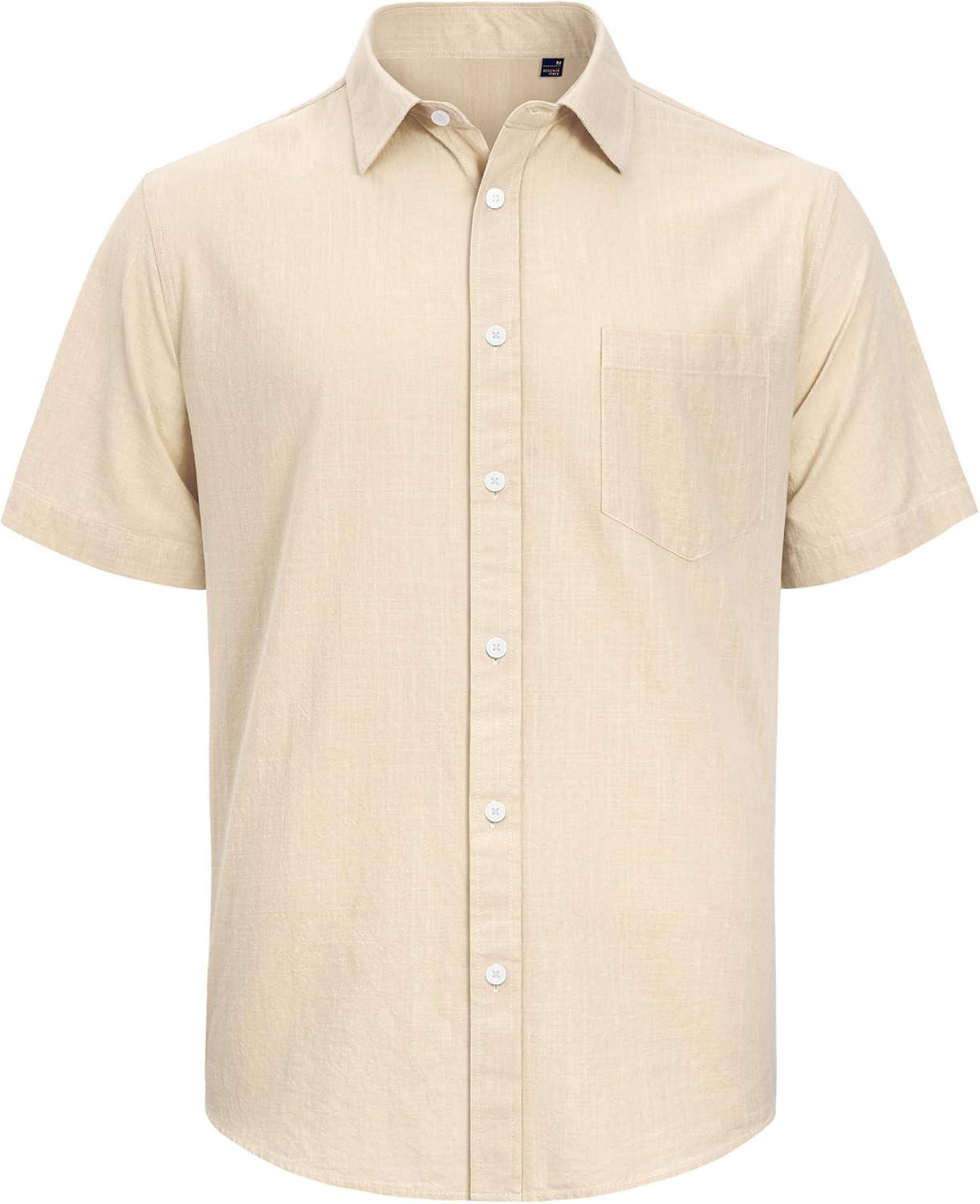 Mens Linen Shirts Short Sleeve Button Down Shirt Casual Cuban Guayabera Lightweight Summer Beach Solid Tops(Light Khaki)