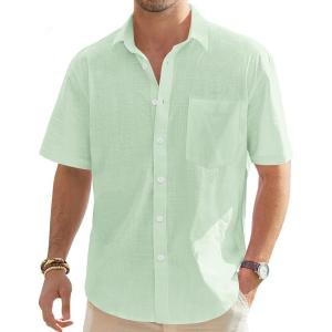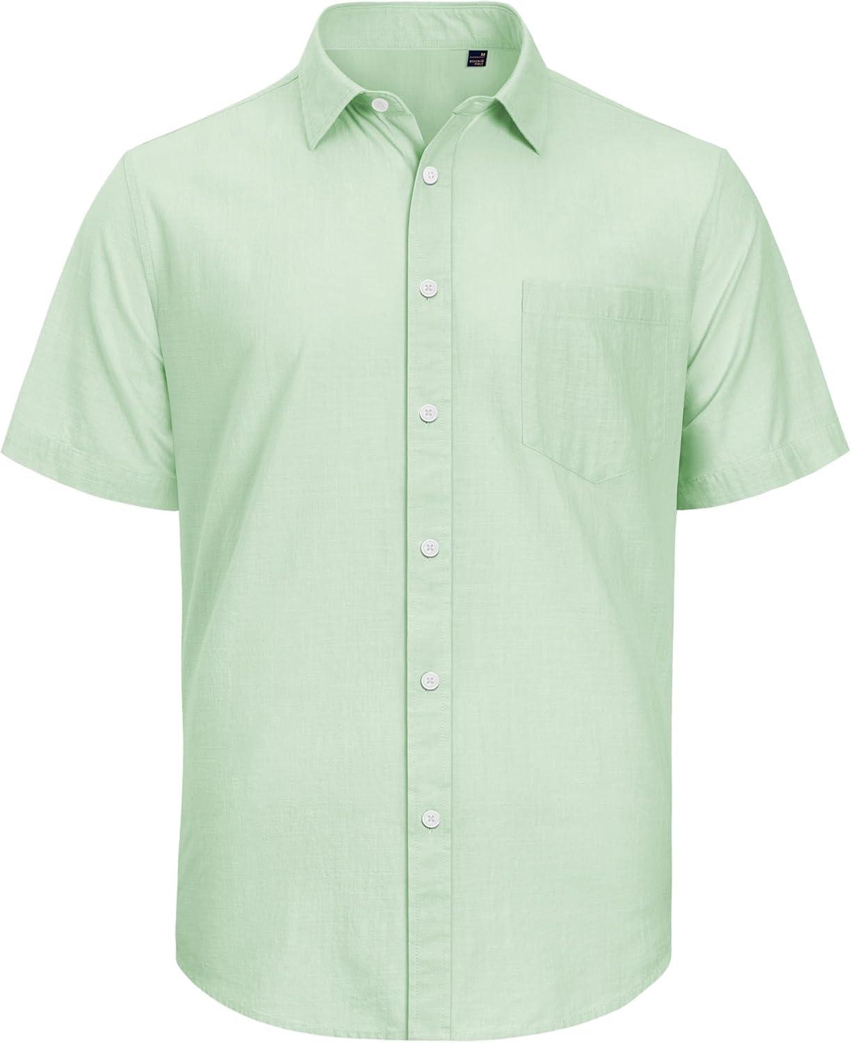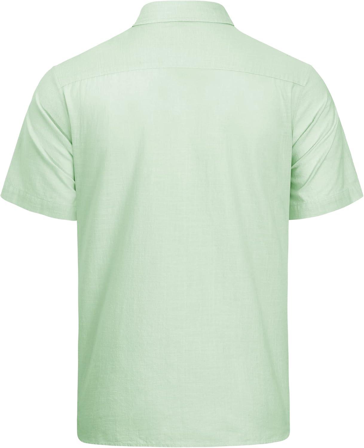 Mens Linen Shirts Short Sleeve Button Down Shirt Casual Cuban Guayabera Lightweight Summer Beach Solid Tops(Light Green)