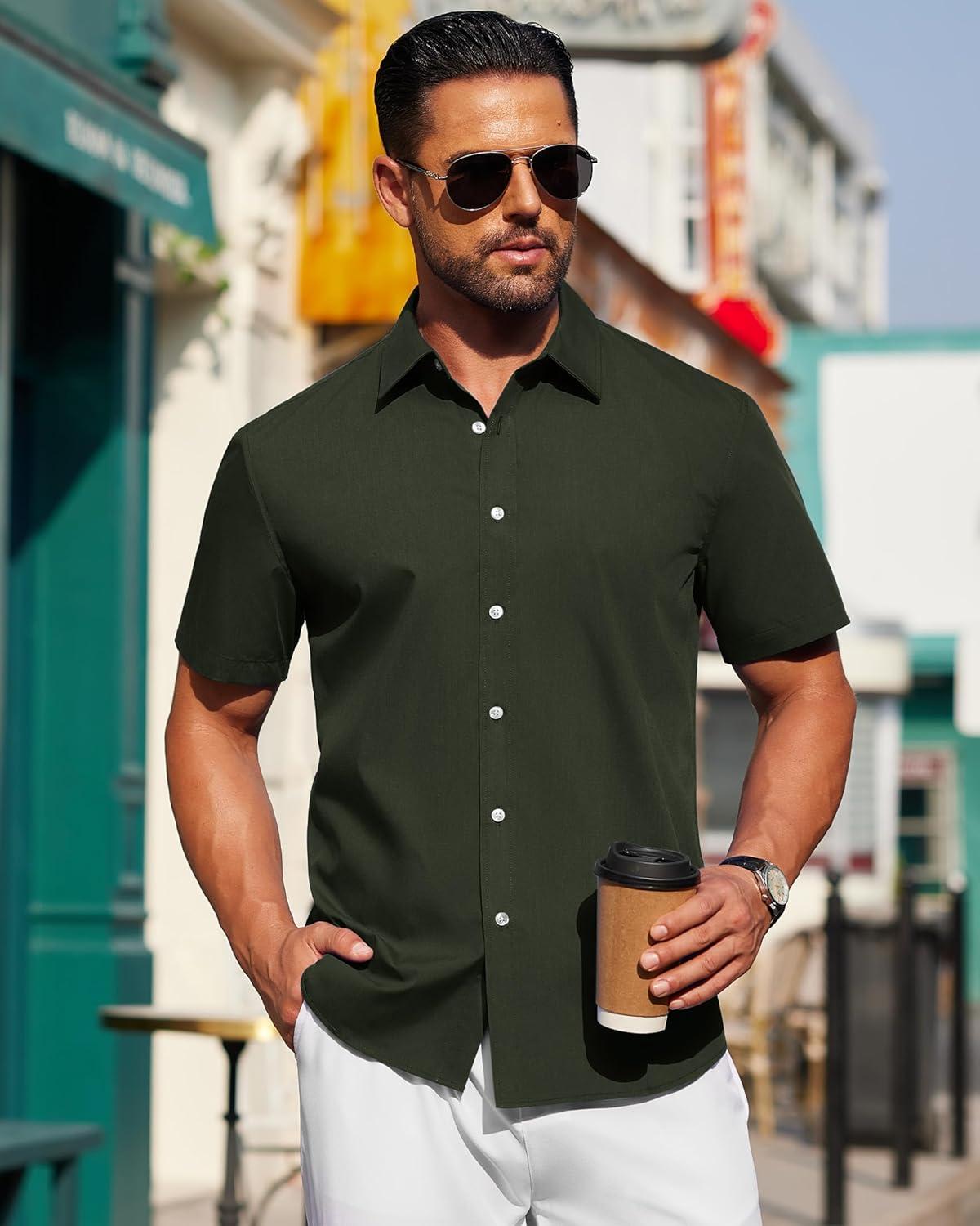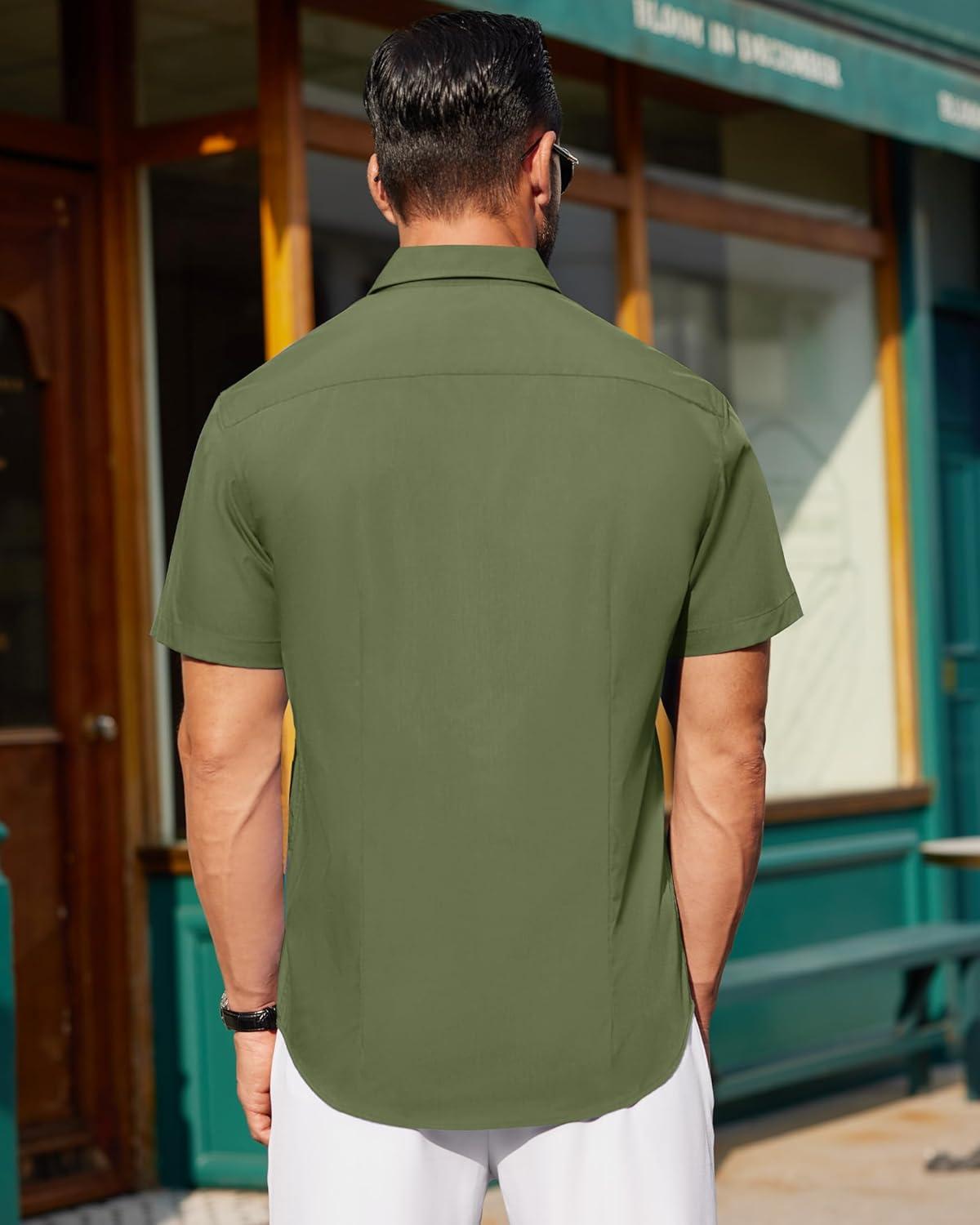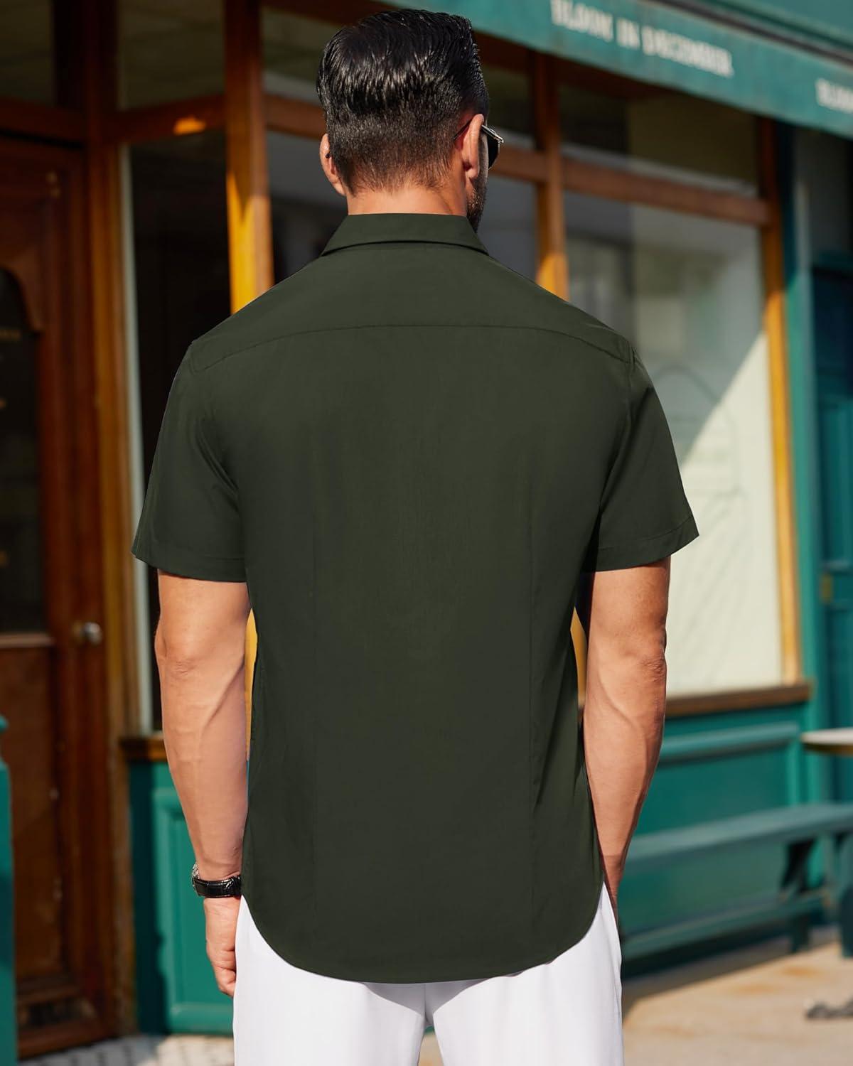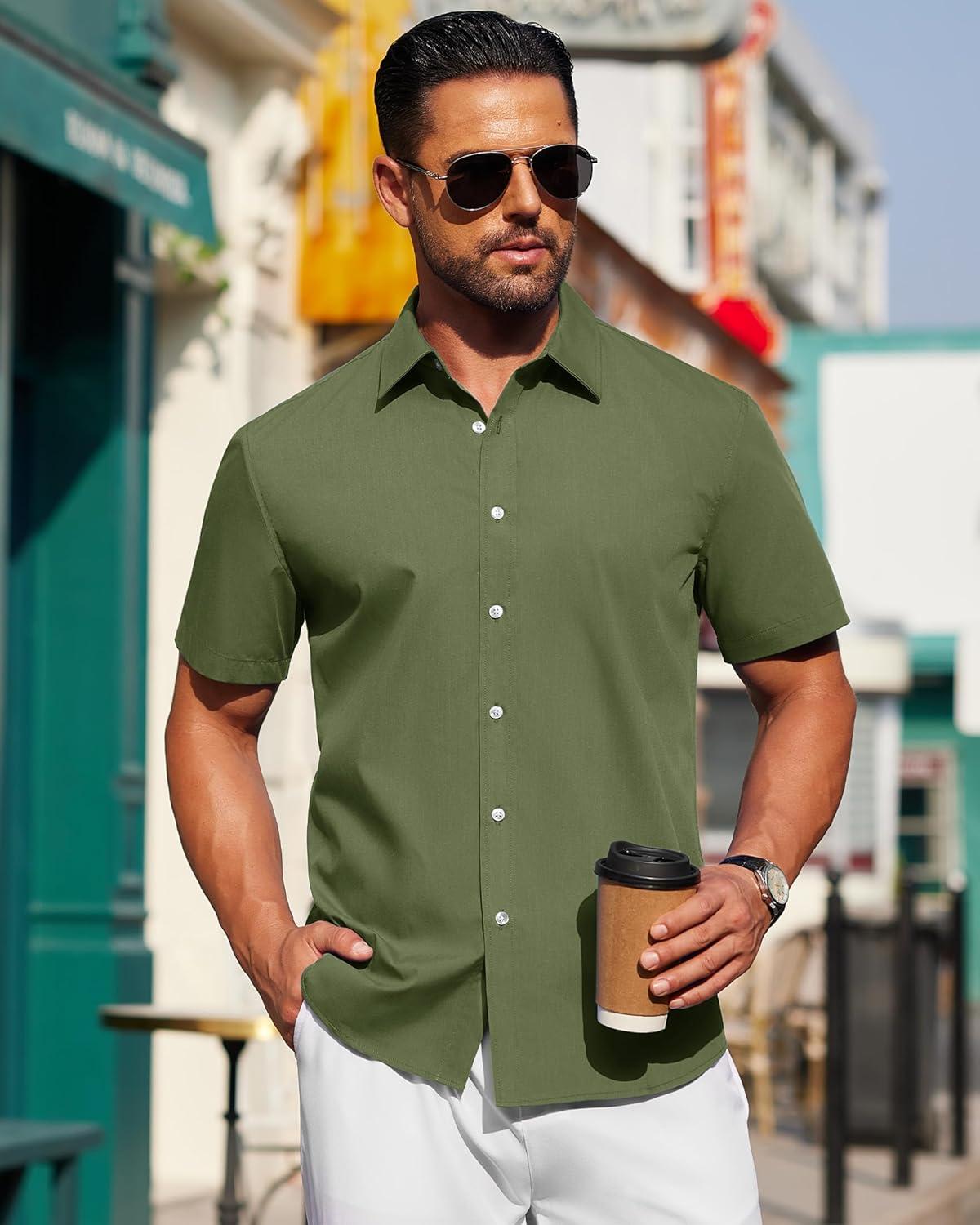 Mens Linen Shirts Short Sleeve Button Down Shirt Casual Cuban Guayabera Lightweight Summer Beach Solid Tops(Army Green)