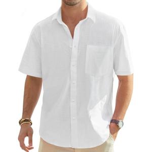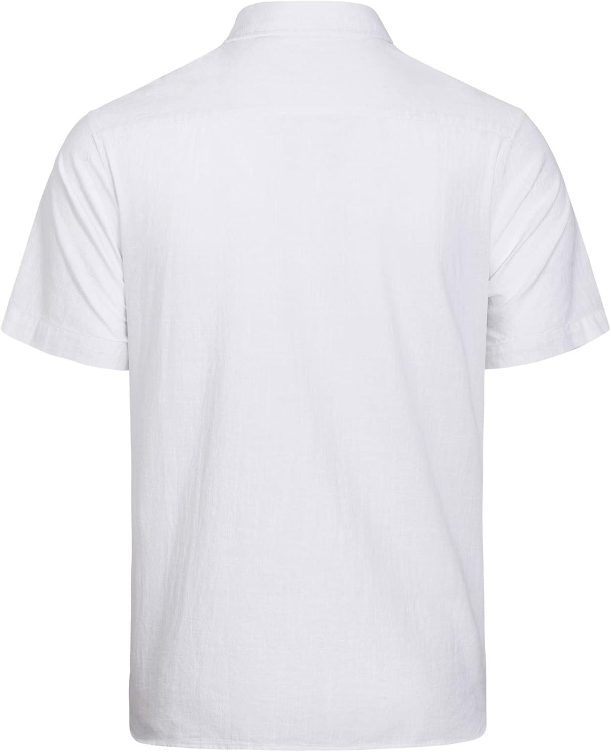Mens Linen Shirts Short Sleeve Button Down Shirt Casual Cuban Guayabera Lightweight Summer Beach Solid Tops(White)