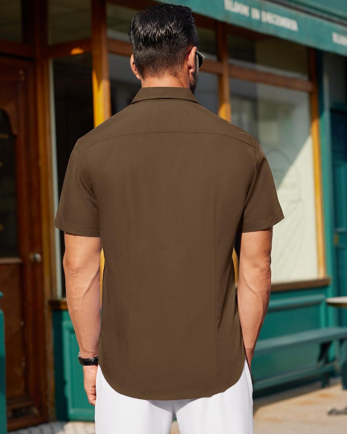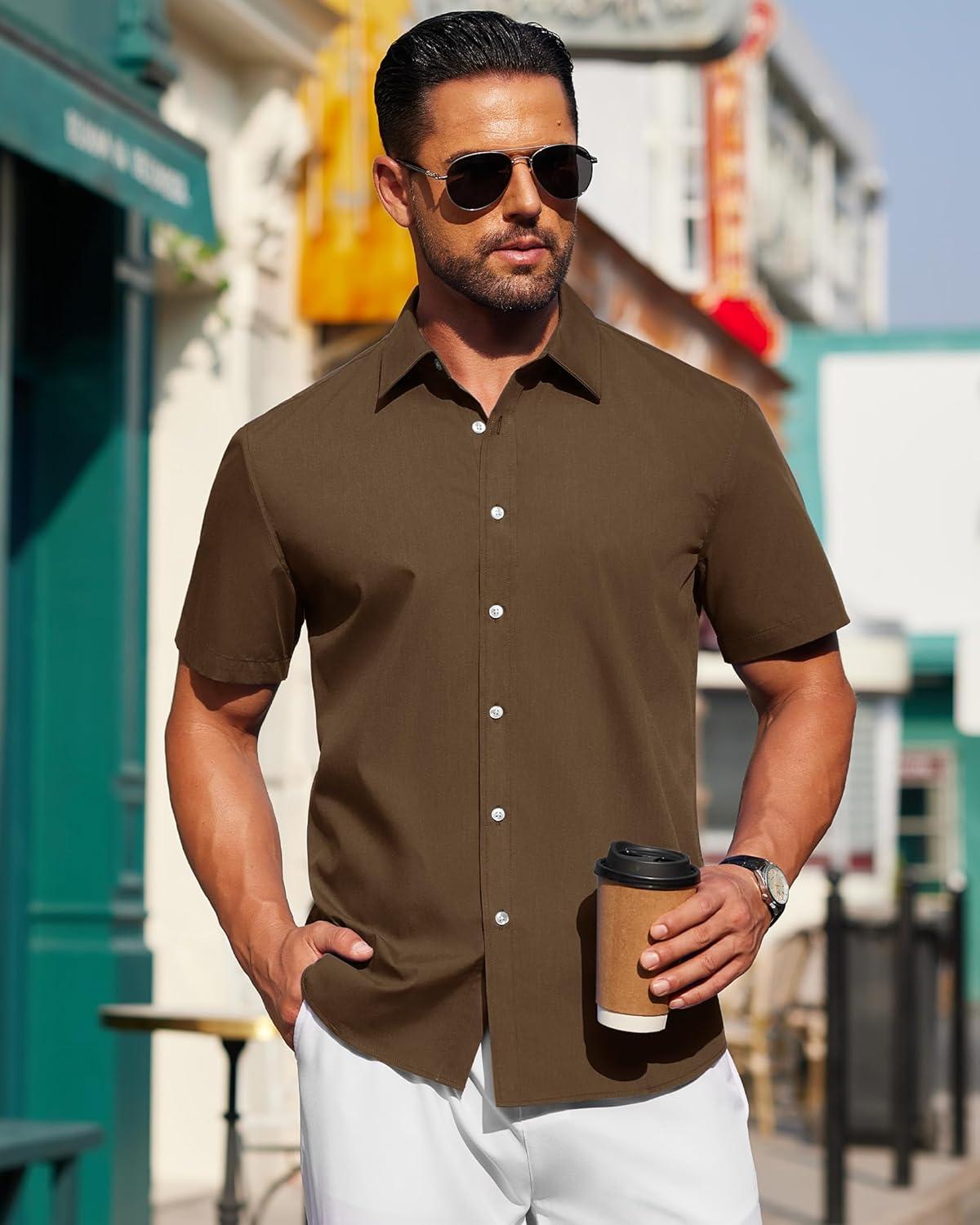 Mens Linen Shirts Short Sleeve Button Down Shirt Casual Cuban Guayabera Lightweight Summer Beach Solid Tops(Coffee)