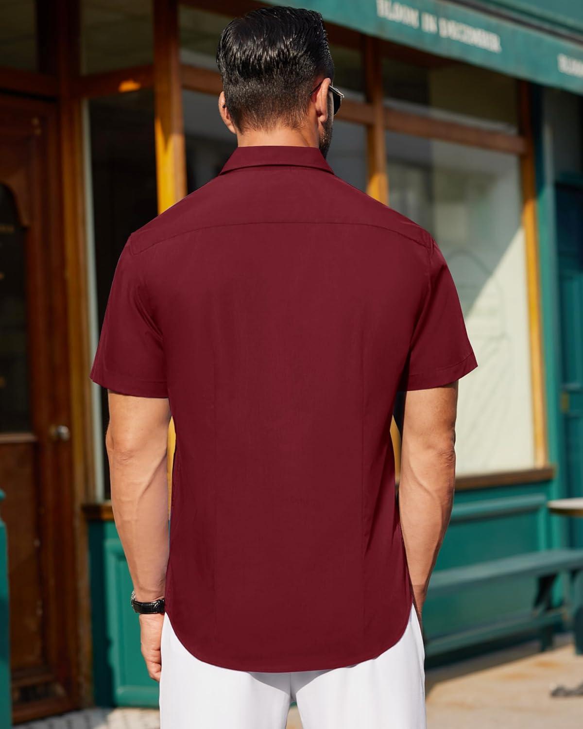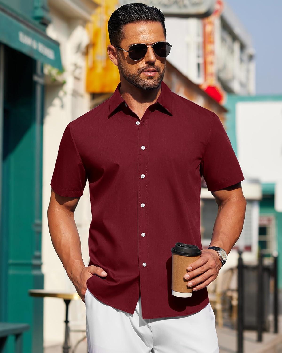 Mens Linen Shirts Short Sleeve Button Down Shirt Casual Cuban Guayabera Lightweight Summer Beach Solid Tops(Burgundy)