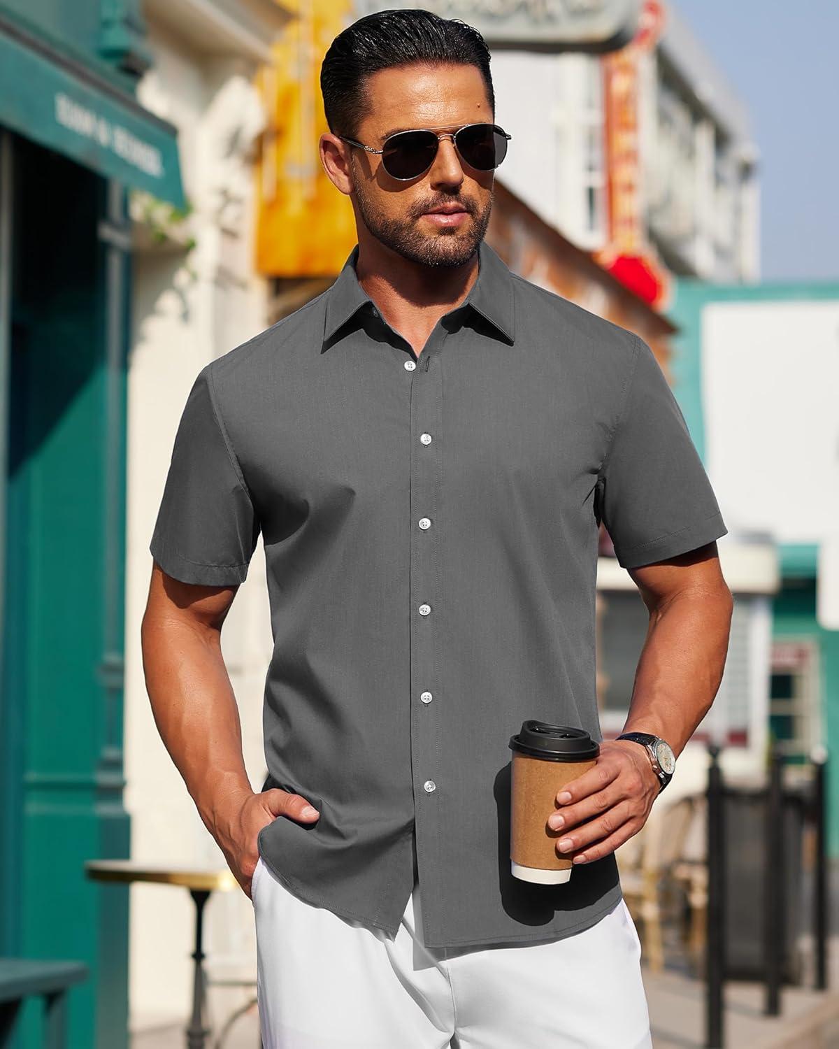 Mens Linen Shirts Short Sleeve Button Down Shirt Casual Cuban Guayabera Lightweight Summer Beach Solid Tops(Dark Grey)