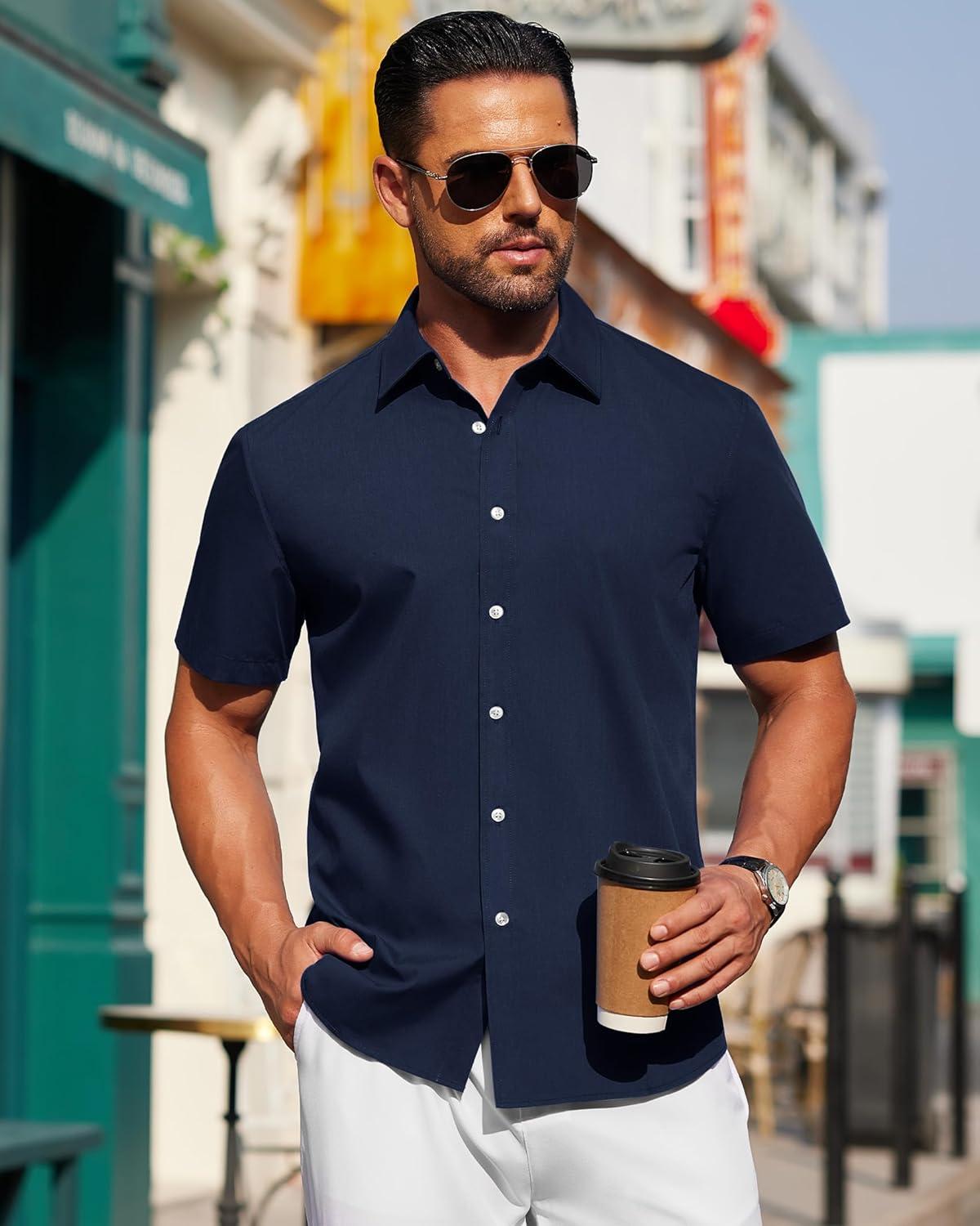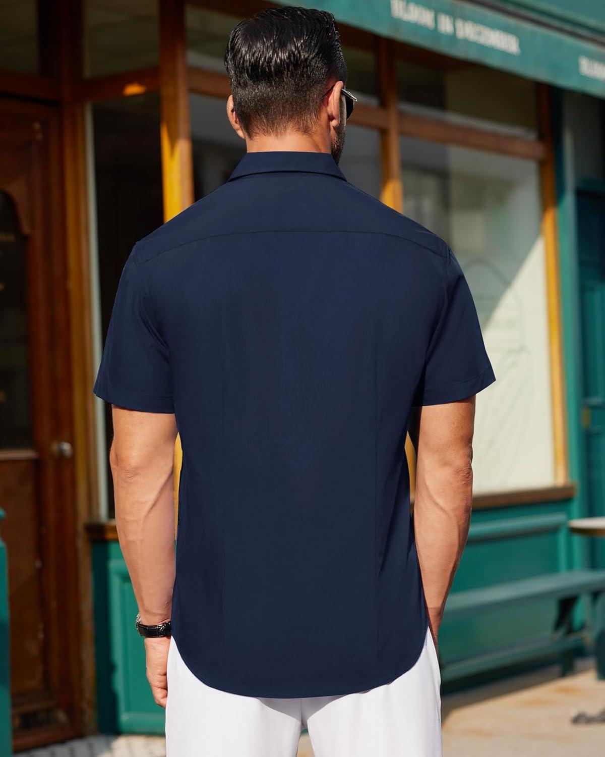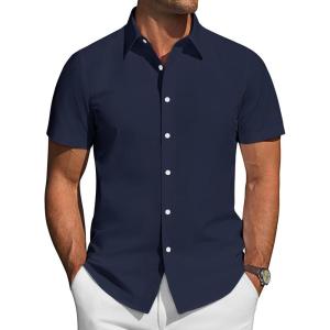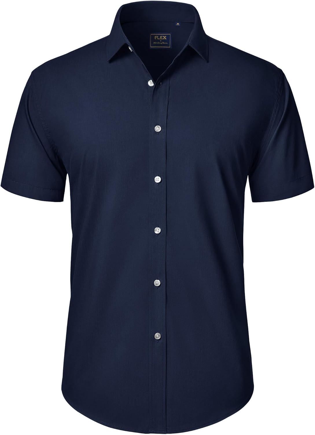 J.VER Mens Short Sleeve Button Down Shirt Stretch Business Casual Dress Shirts Solid Summer Wedding Prom Tops(Navy Blue)