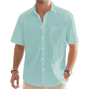 Mens Linen Shirts Short Sleeve Button Down Shirt Casual Cuban Guayabera Lightweight Summer Beach Solid Tops(Teal)